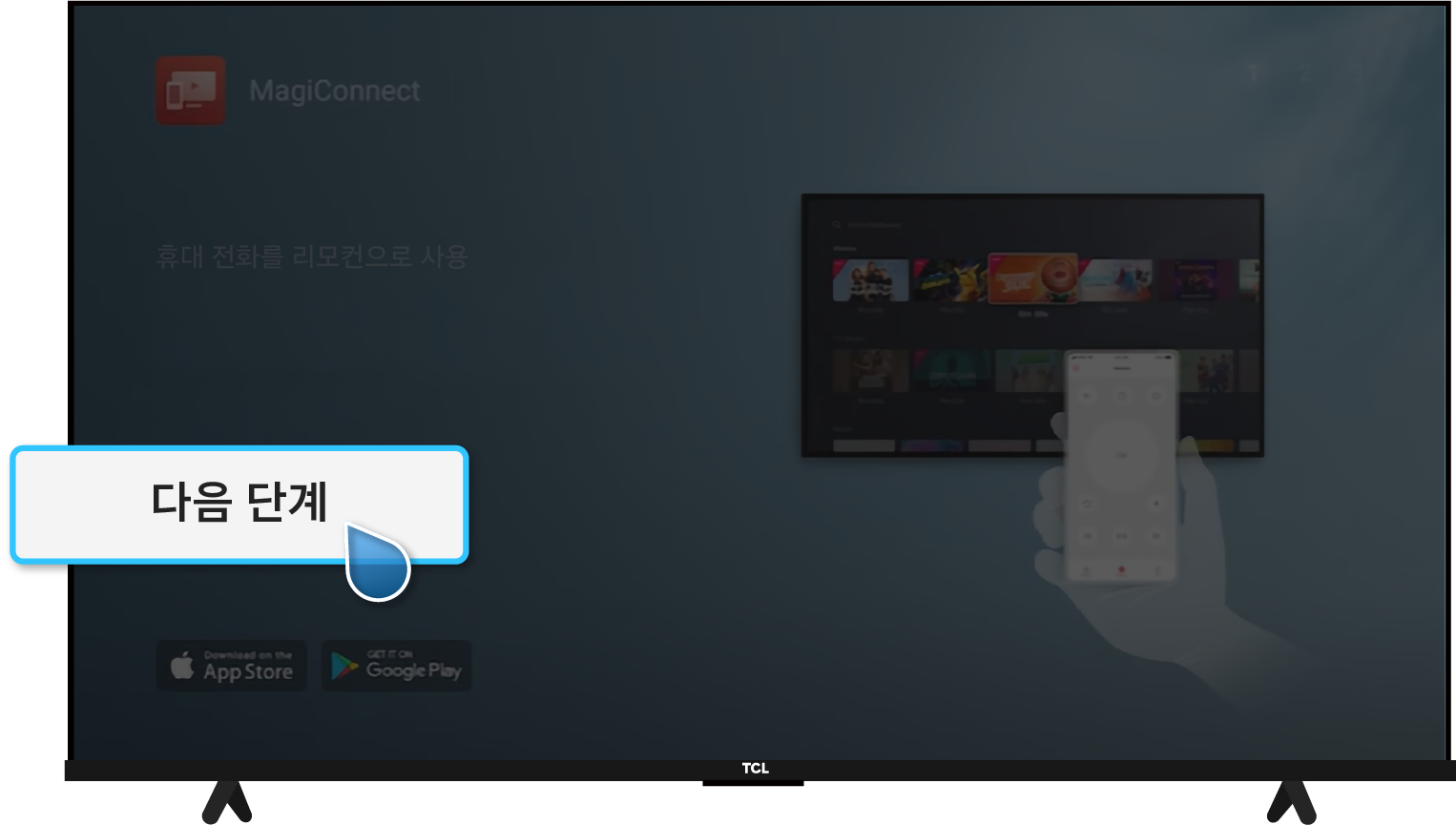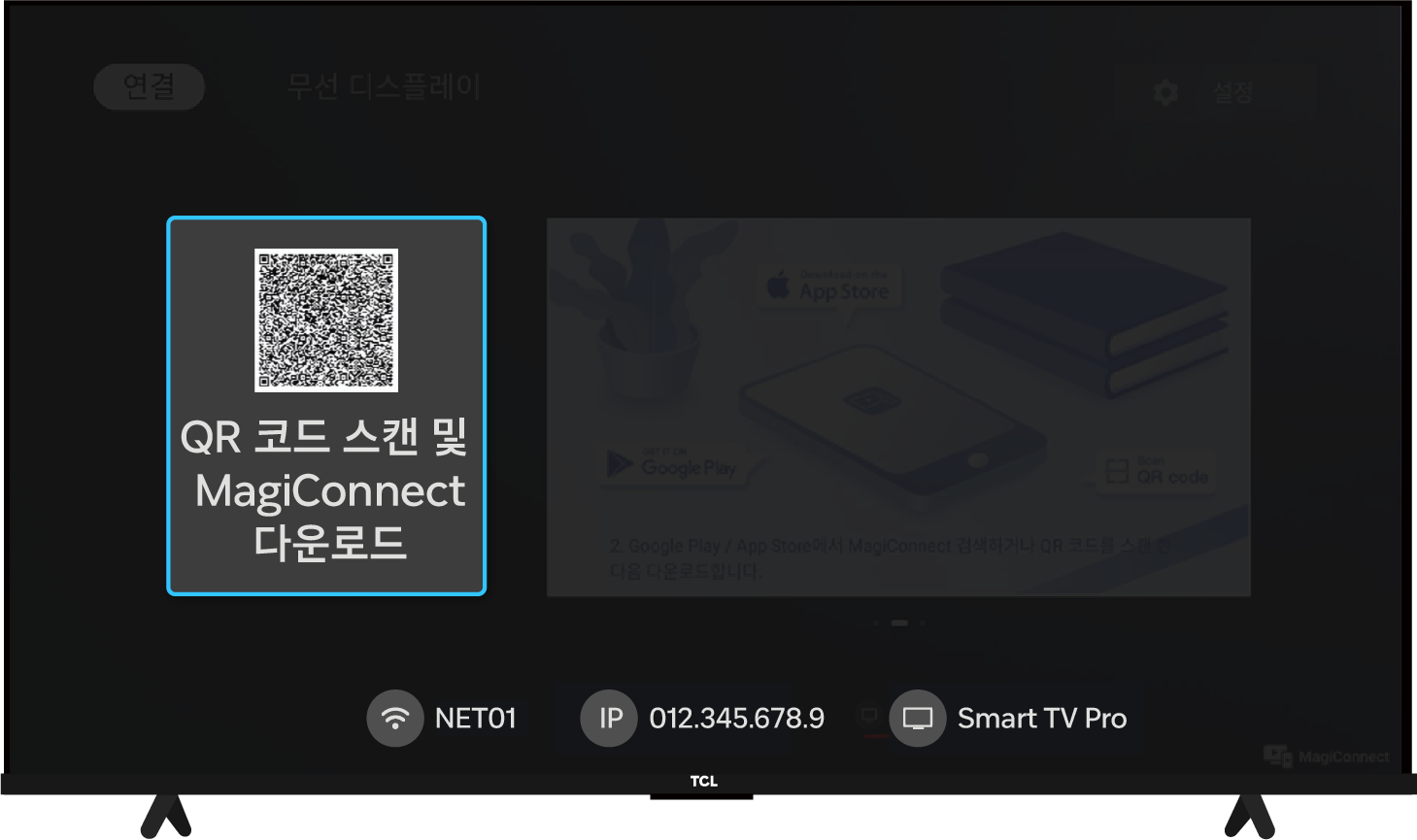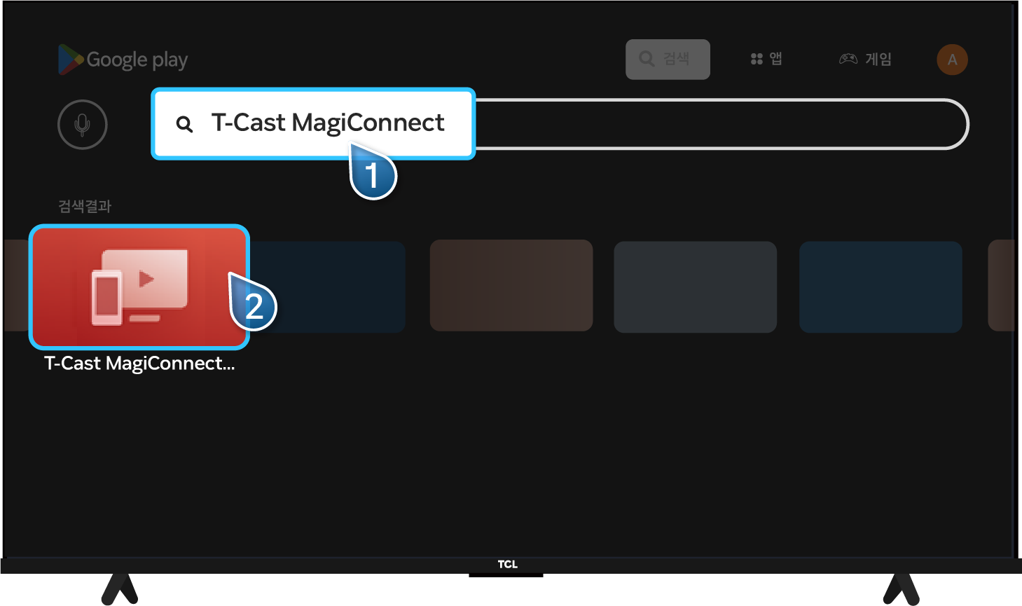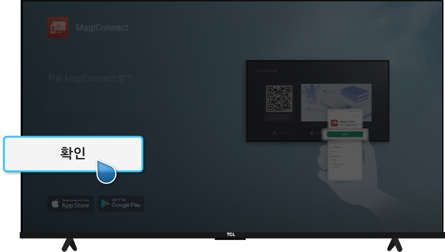 TCL 리모컨 설정(⚙️) → 대시 보드 설정(⚙️) → 앱 → 모든 앱 보기 → Google Play 스토어 → 열기 → T-Cast MagiConnect 검색 후 앱 클릭 → T-Cast MagiConnect 설치 후 앱 열기 → TV 화면의 QR코드로 핸드폰에 앱 설치