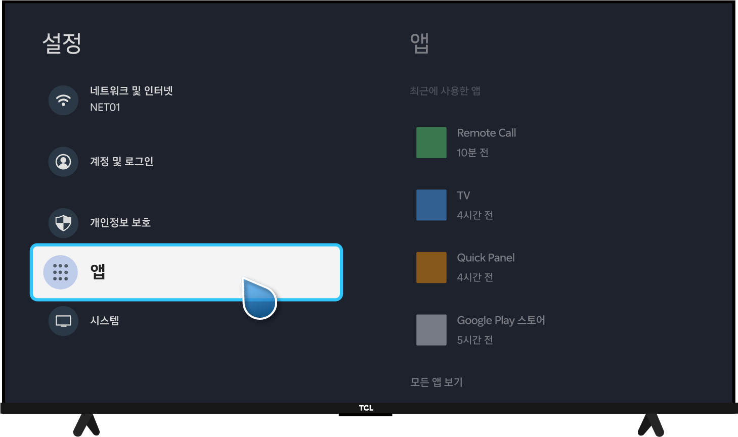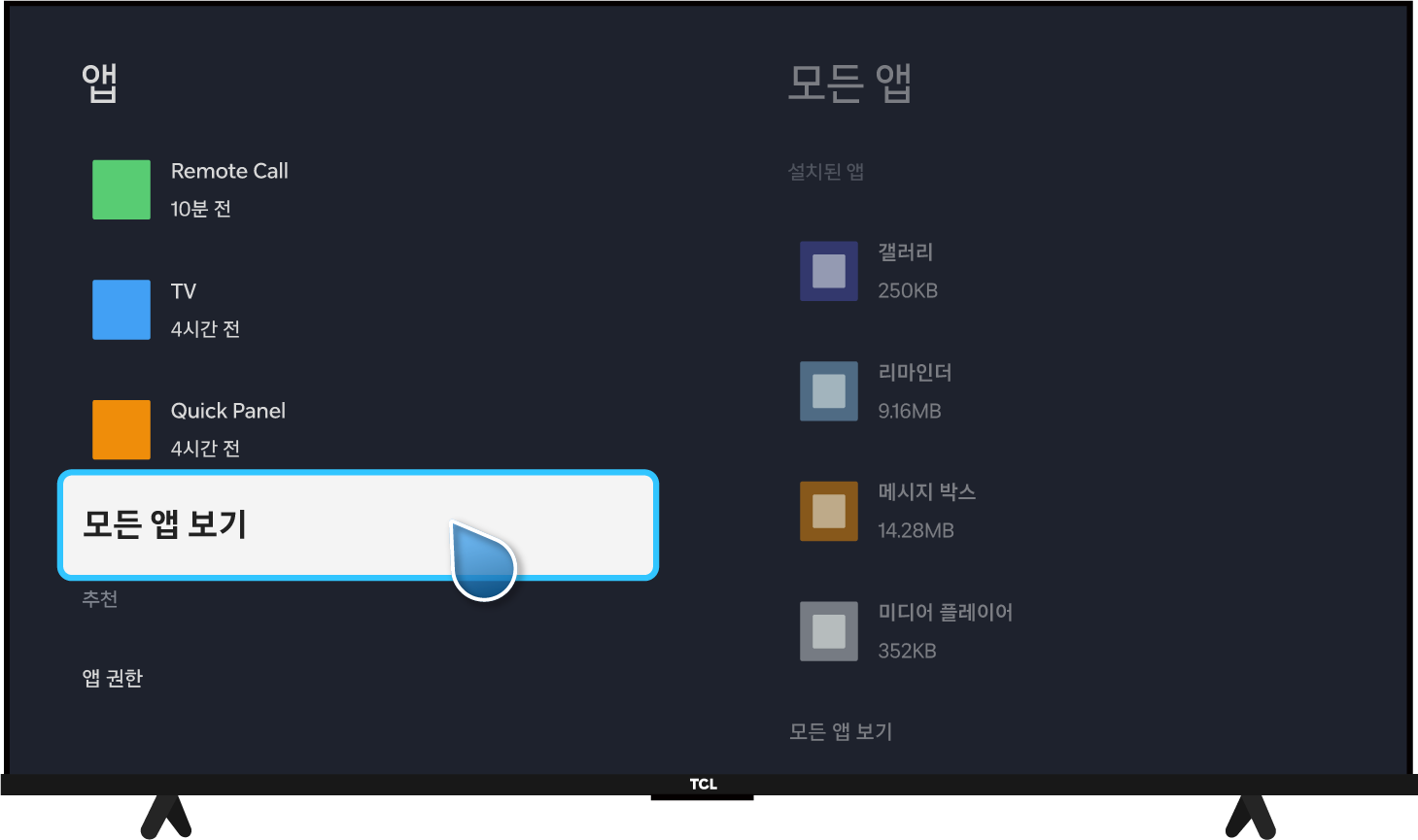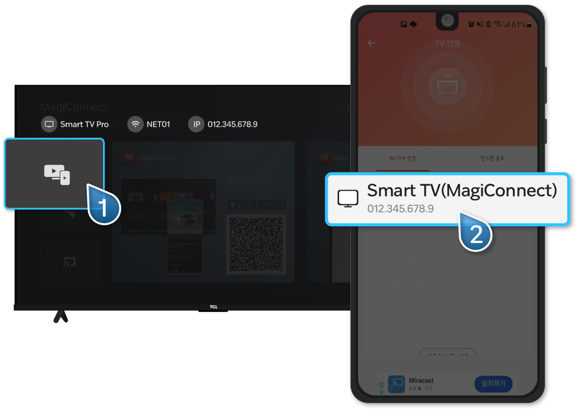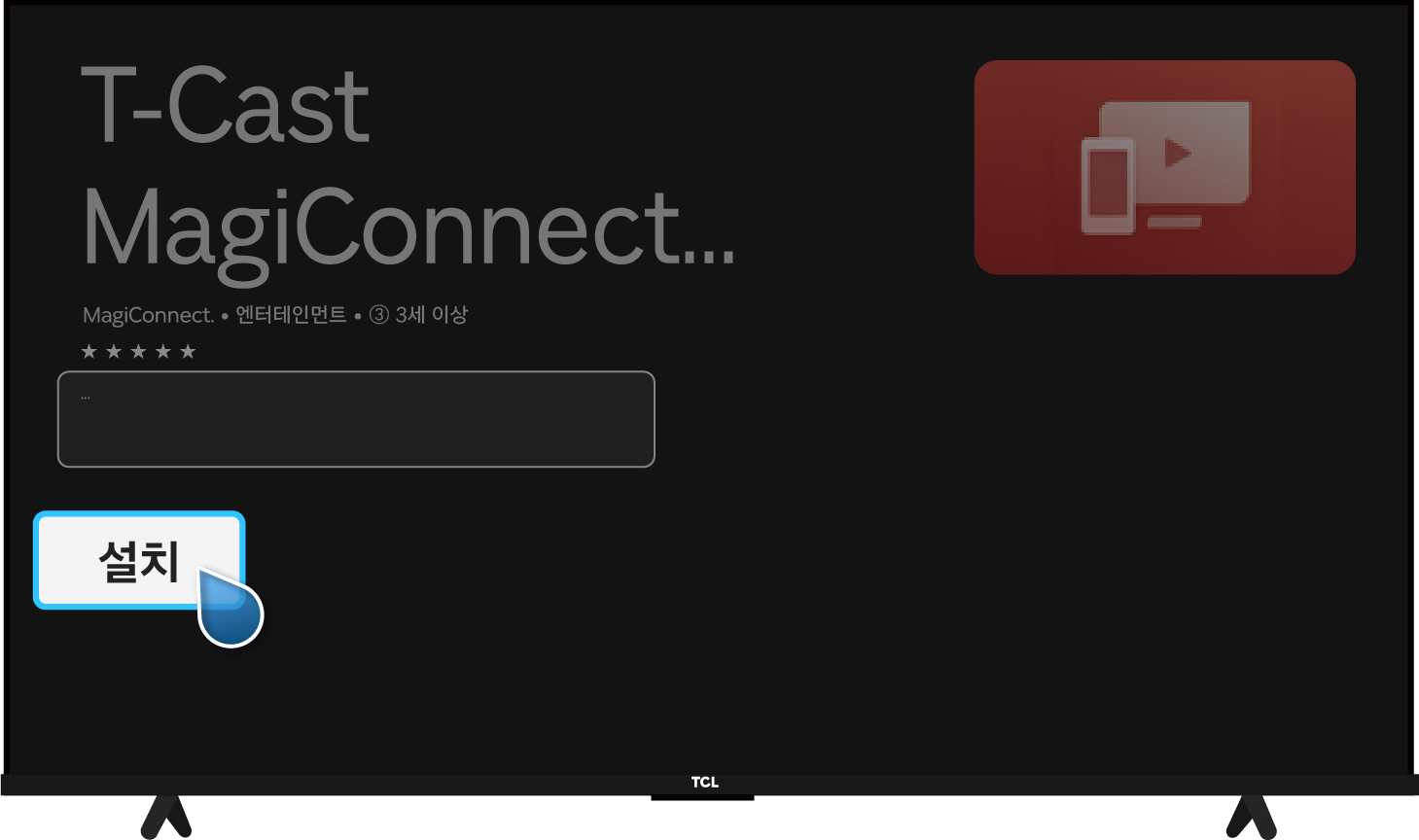 TCL 리모컨 설정(⚙️) → 대시 보드 설정(⚙️) → 앱 → 모든 앱 보기 → Google Play 스토어 → 열기 → T-Cast MagiConnect 검색 후 앱 클릭 → T-Cast MagiConnect 설치 후 앱 열기 → TV 화면의 QR코드로 핸드폰에 앱 설치