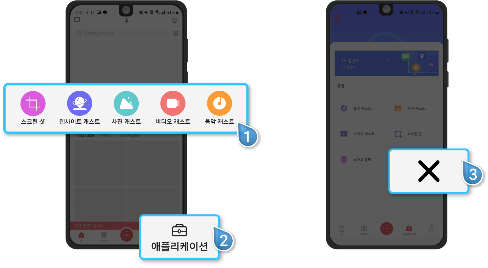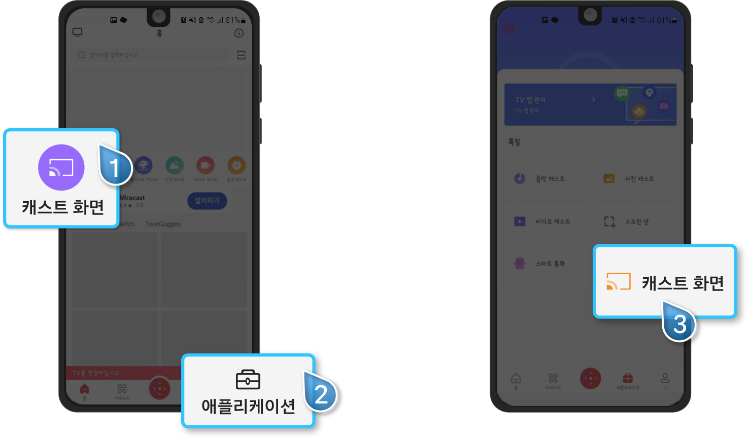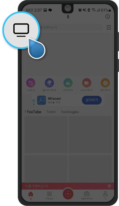 ⑦ 연결이 정상적으로 된 이후에는 캐스트 화면 버튼을 통해 애플리케이션으로 진입한 후 캐스트화면 버튼을 실행하여 미러링 기능을 실시간으로 사용할 수 있습니다.