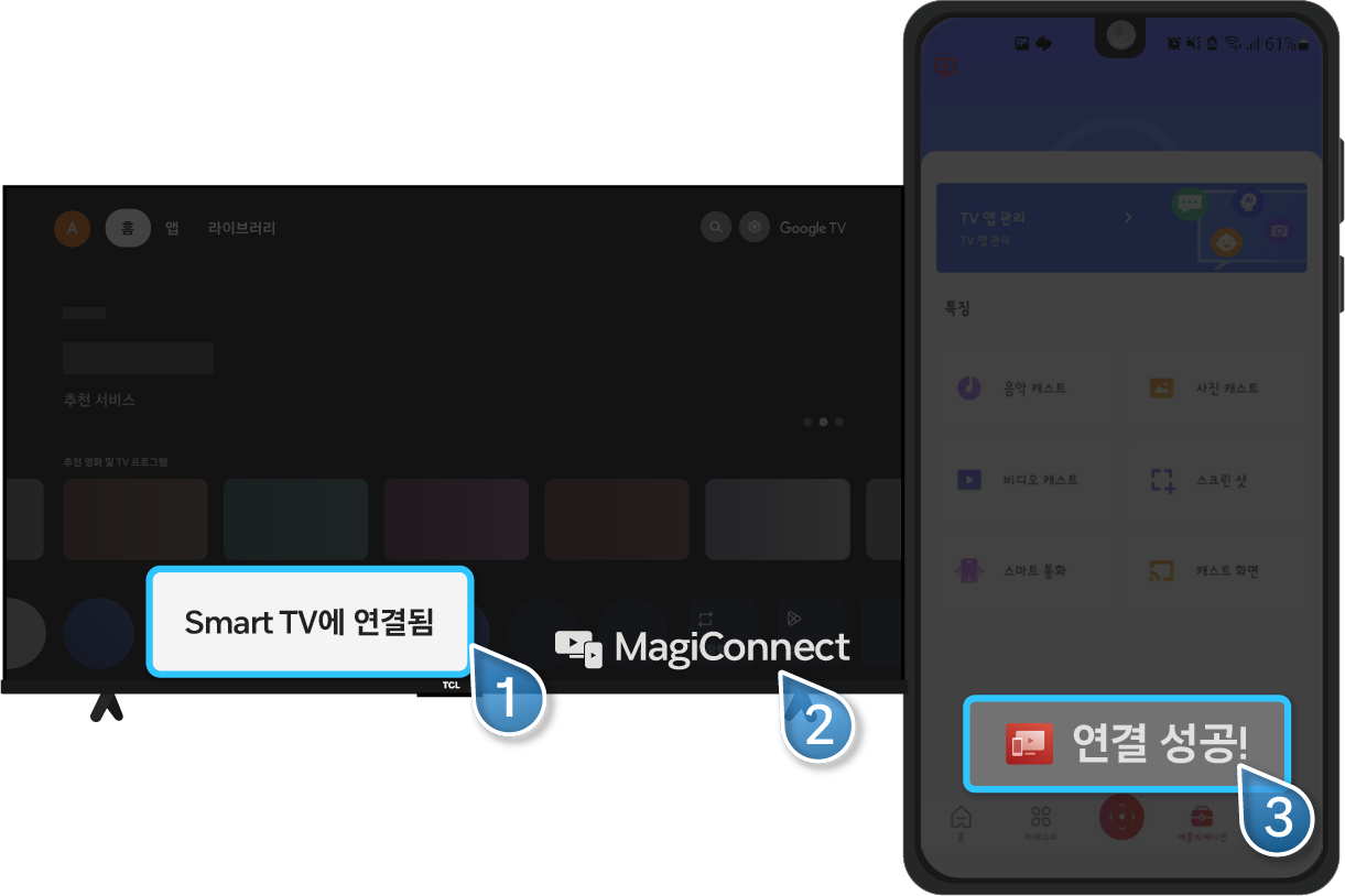 ⑤ TV화면 하단에 연결됨 문구, MagiConnerct 로고가 보여지고 휴대폰에서 연결 성공 버튼이 생깁니다.