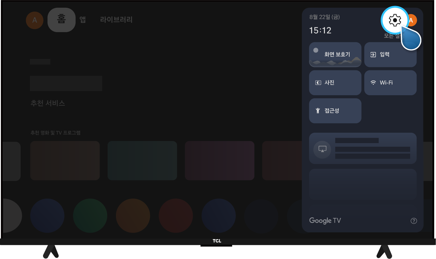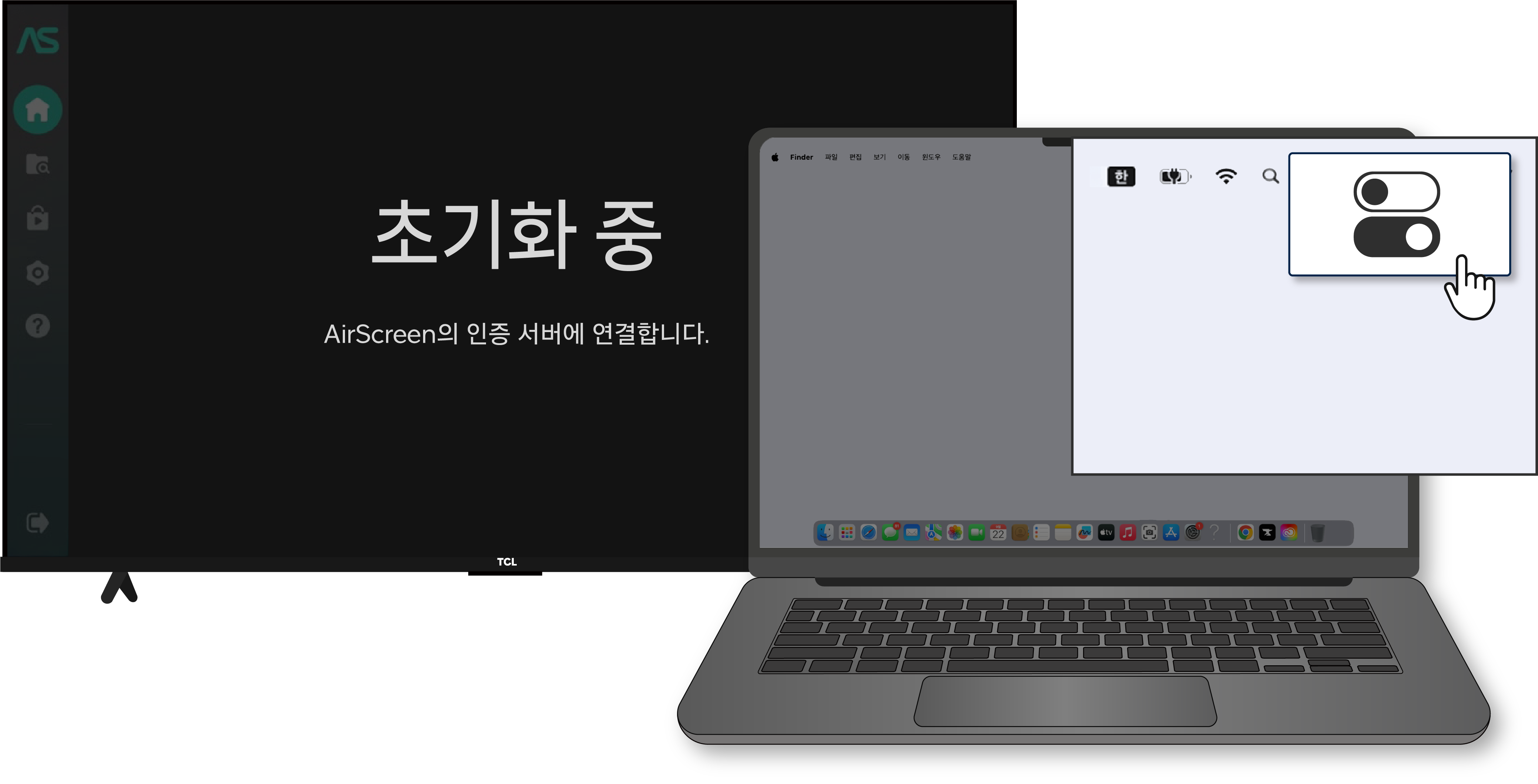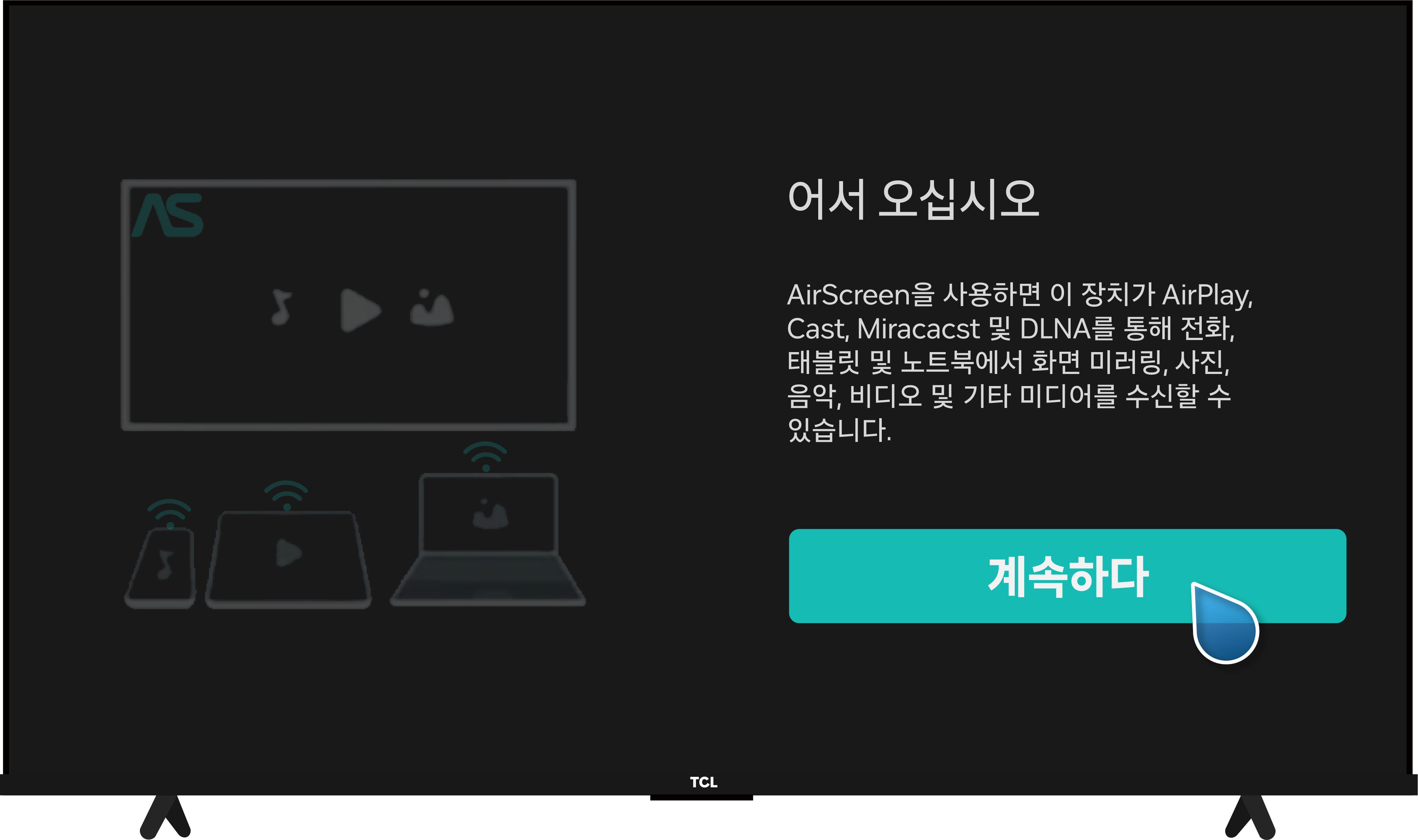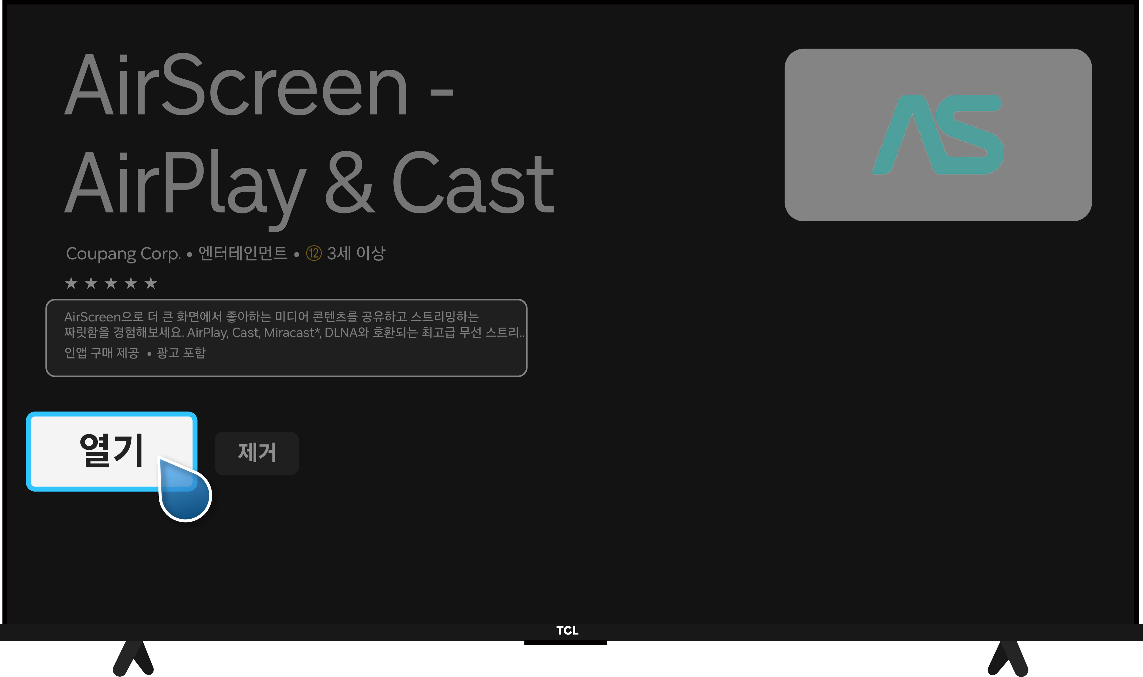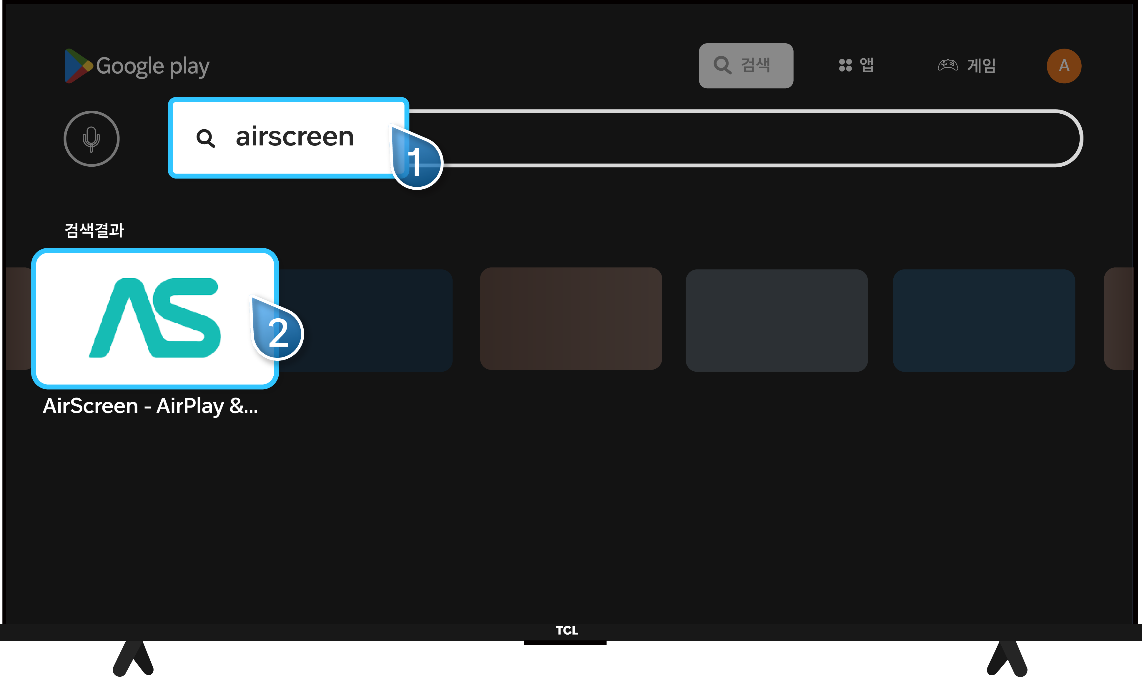 ① TV 설정 방법: TCL 리모컨 설정(⚙️) → 대시 보드 설정(⚙️) → 앱 → 모든 앱 보기 → Google Play 스토어 → 열기 → AirScreen 검색 후 앱 클릭 → AirScreen 설치 후 앱 열기 → 장치 연결