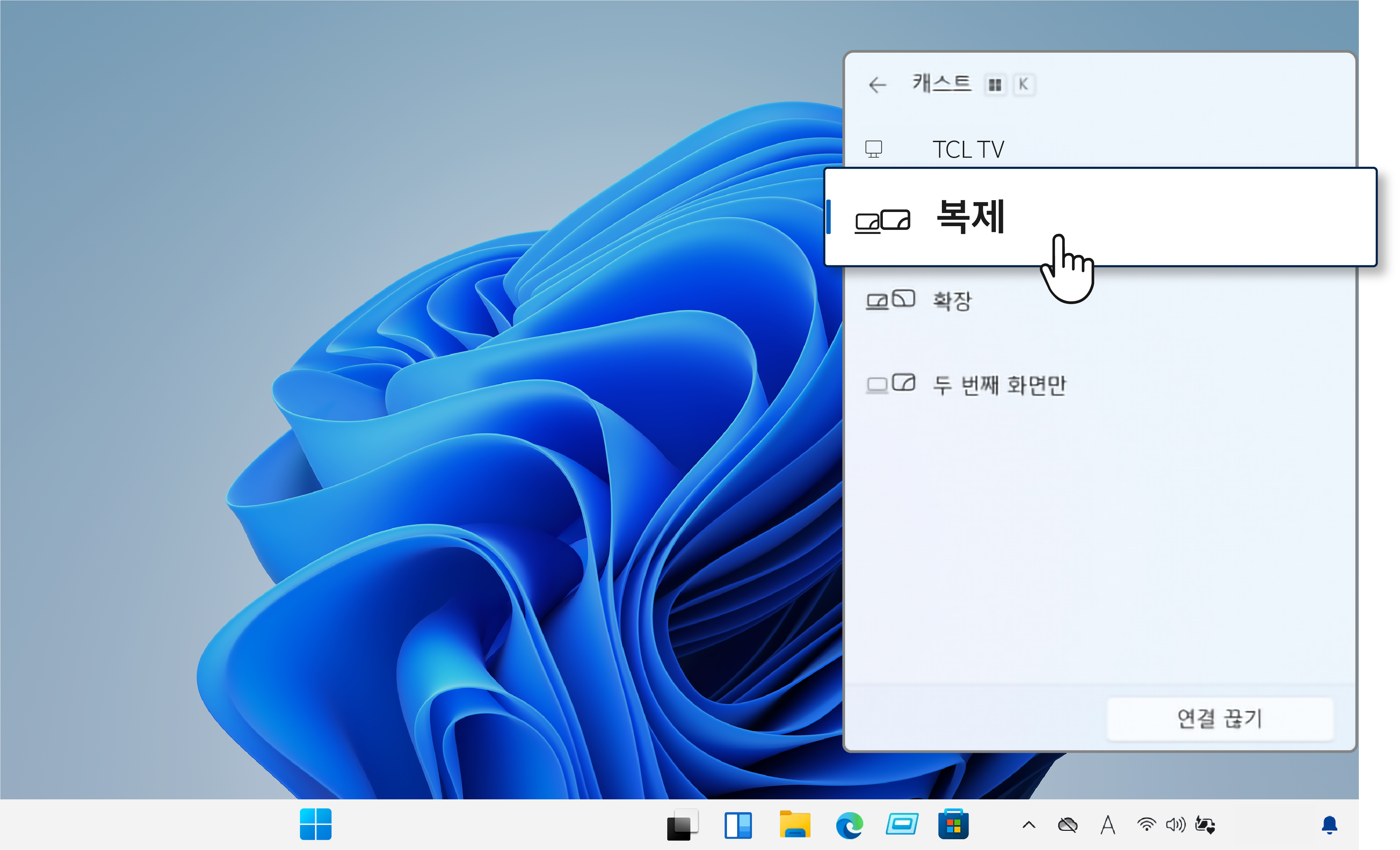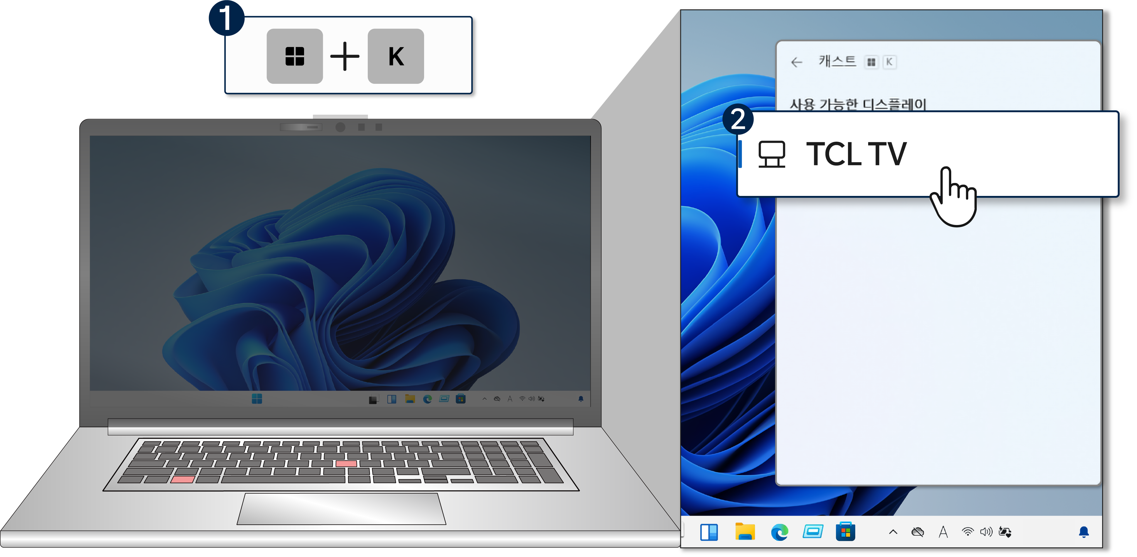 키보드 윈도우 버튼과 K 버튼을 함께 눌러 캐스트 연결창을 실행하고 연결하기 원하는 TV를 목록에서 선택해 주세요.