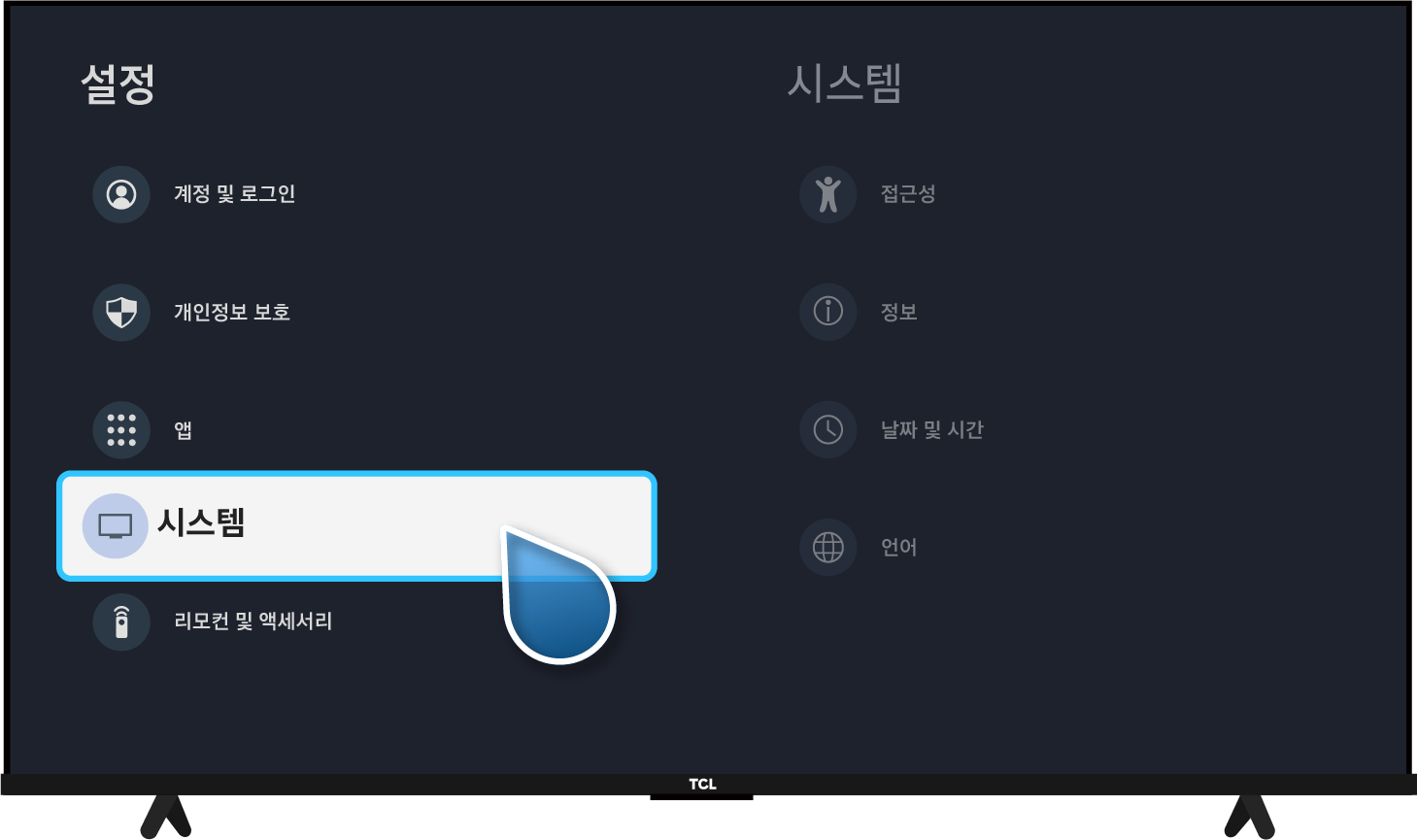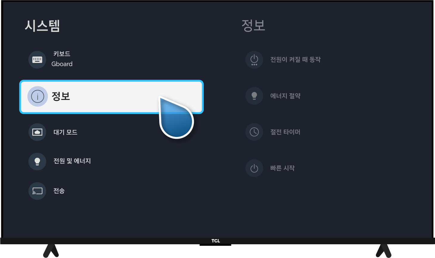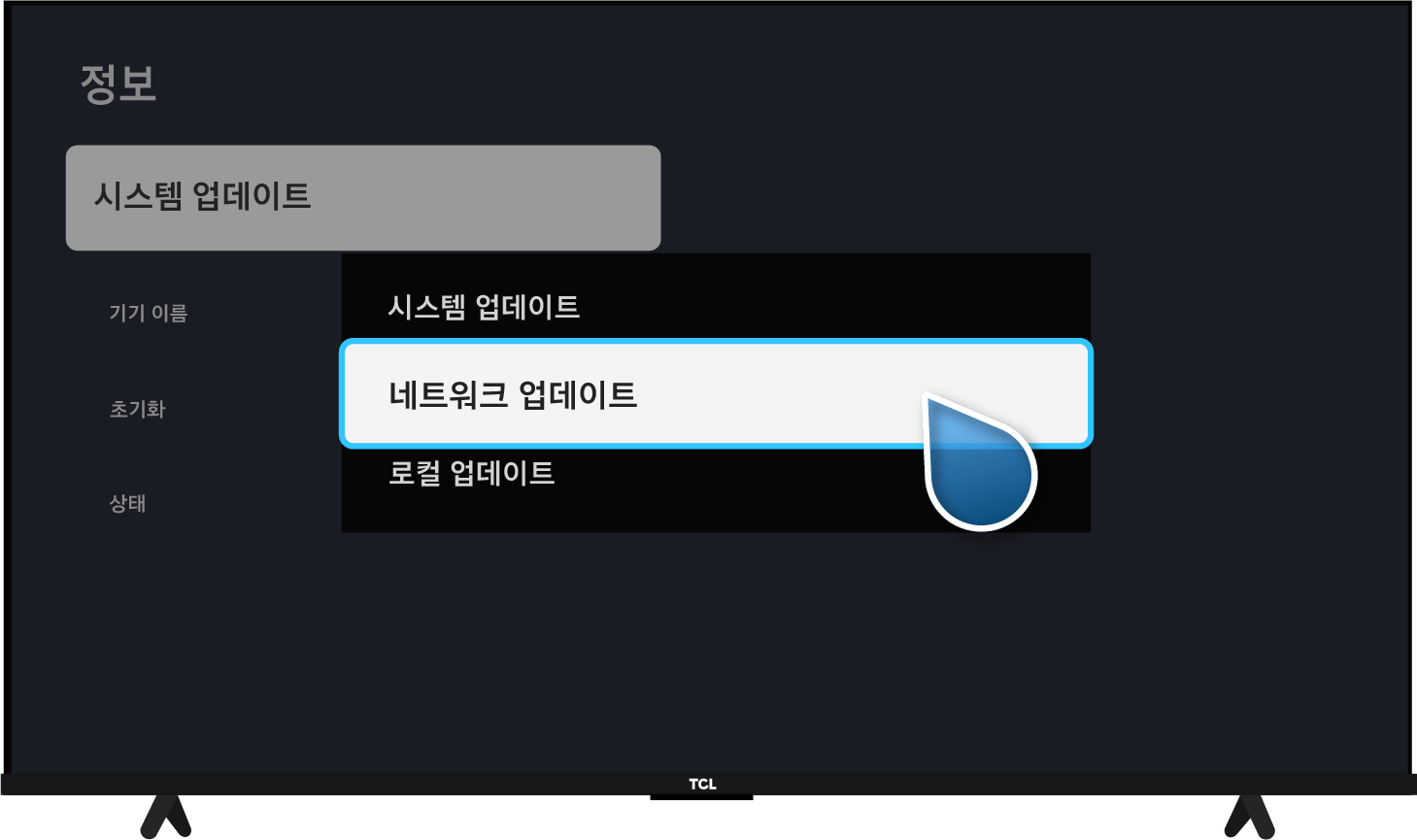 TV 소프트 웨어 업데이트 방법: TCL 리모컨 설정(⚙️) → 대시 보드 설정(⚙️) → 시스템 → 정보 → 시스템 업데이트 → 네트워크 업데이트