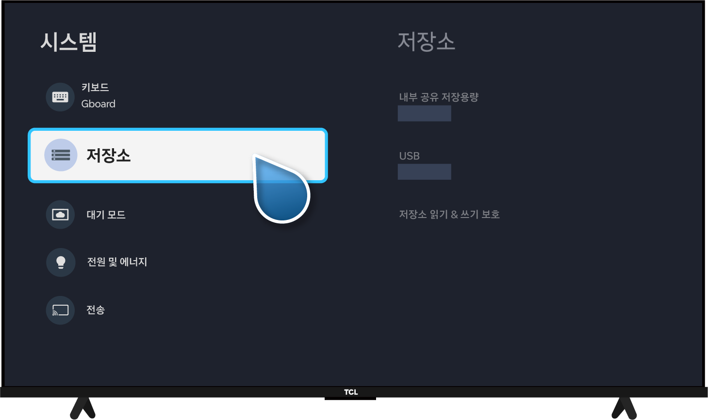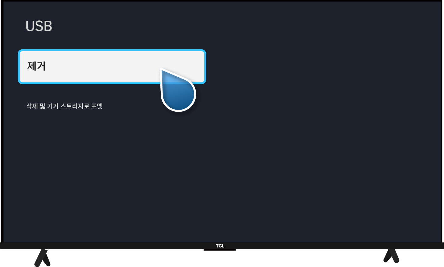 TV 설정 방법: TCL 리모컨 설정(⚙️) → 대시 보드 설정(⚙️) → 시스템 → 저장소 → USB → 제거