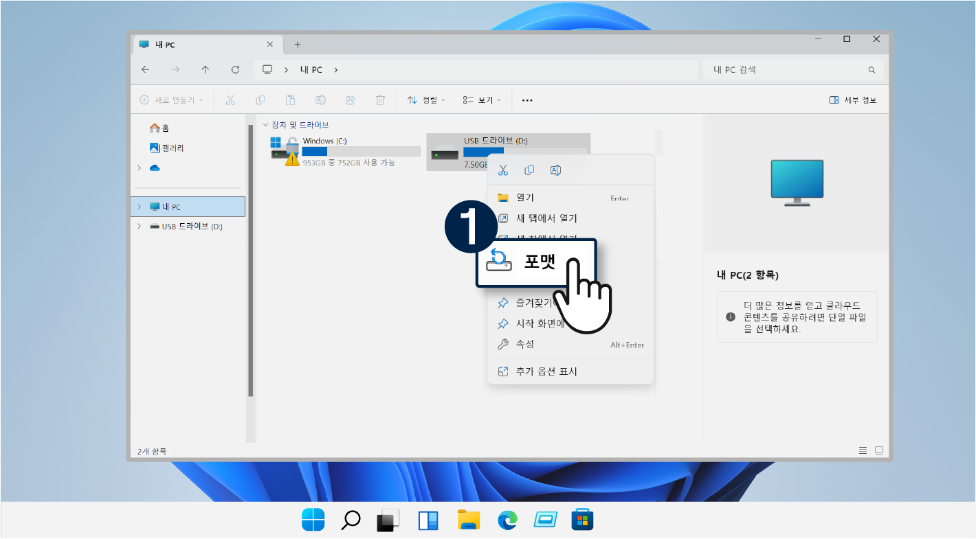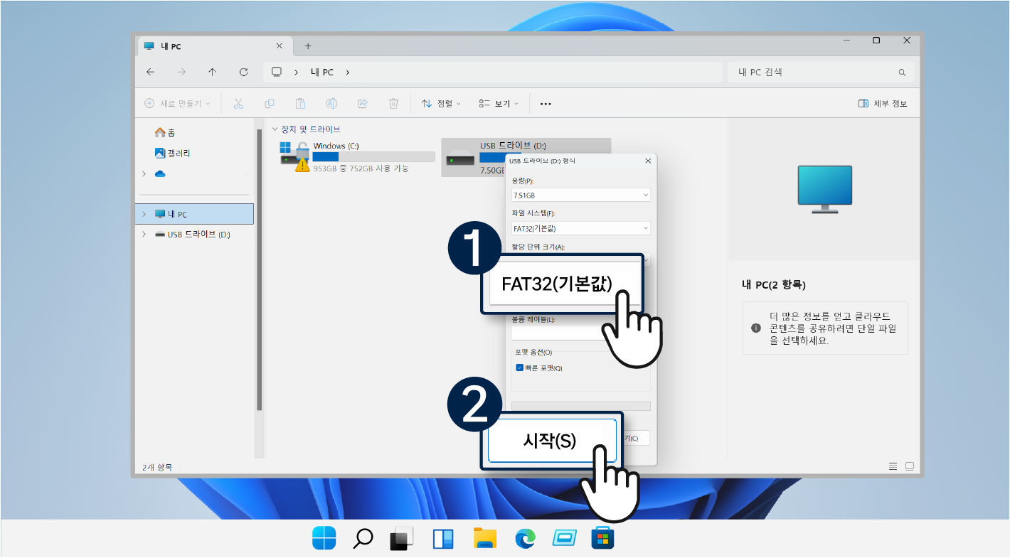PC에서 인식된 USB 저장 장치를 우클릭하여 [포맷]을 선택 후 FAT32로 설정하여 [시작]을 눌러주세요.