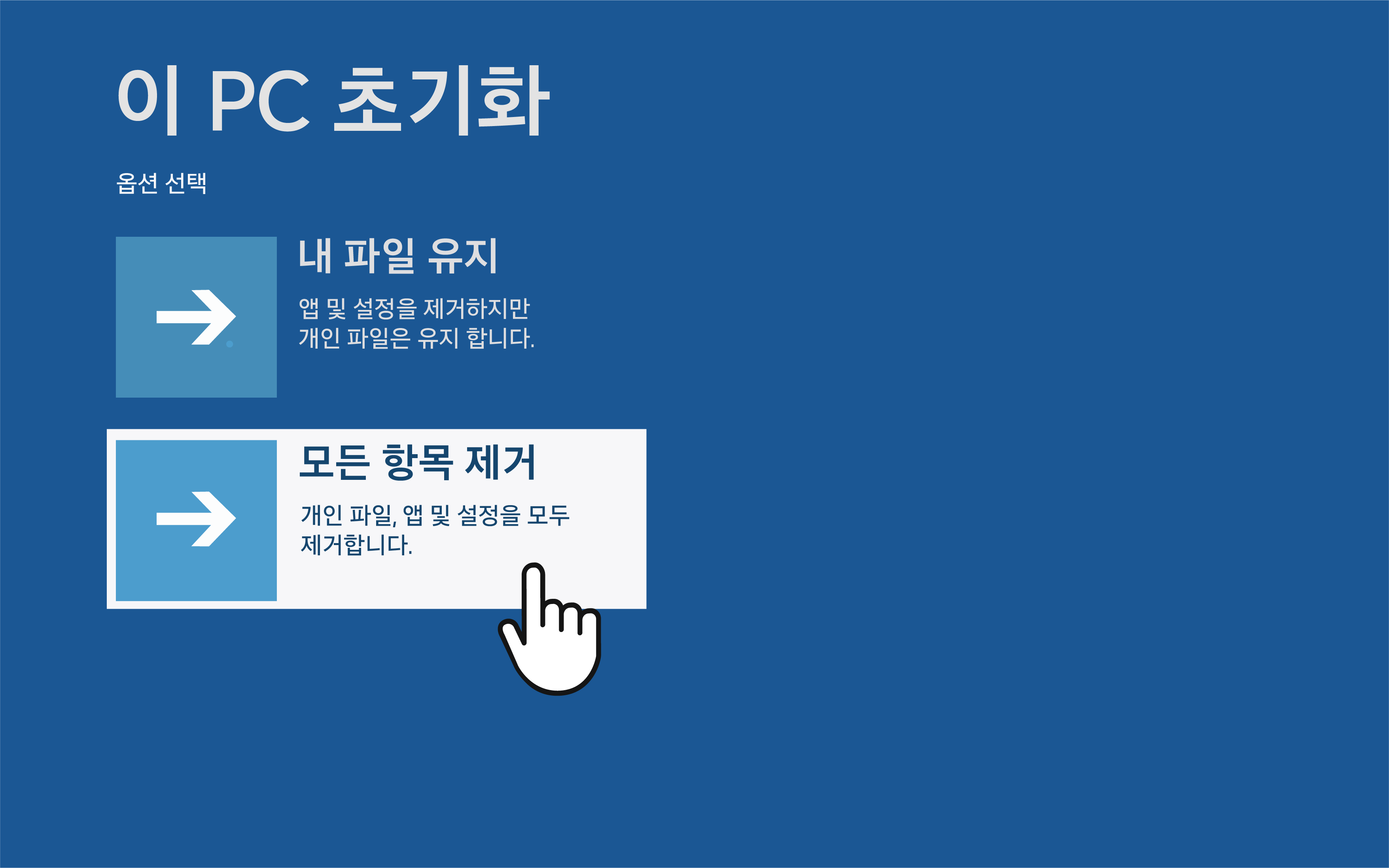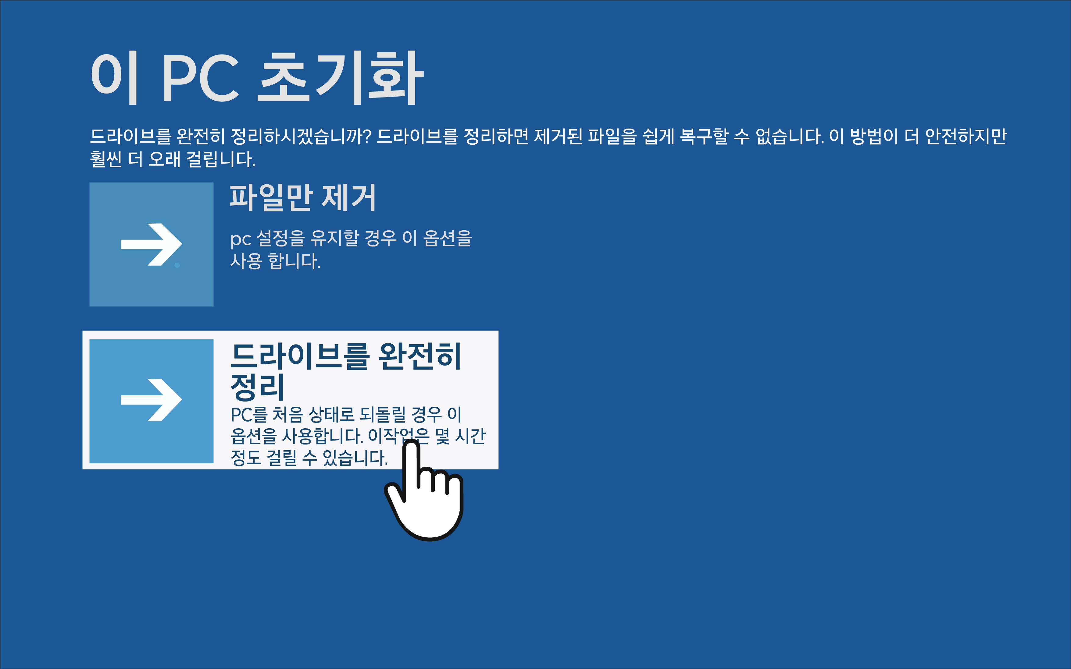② '문제 해결 → 이 PC 초기화 → 모든 항목 제거 → 로컬 다시 설치 → 드라이브를 완전히 정리' 를 클릭해 주세요.