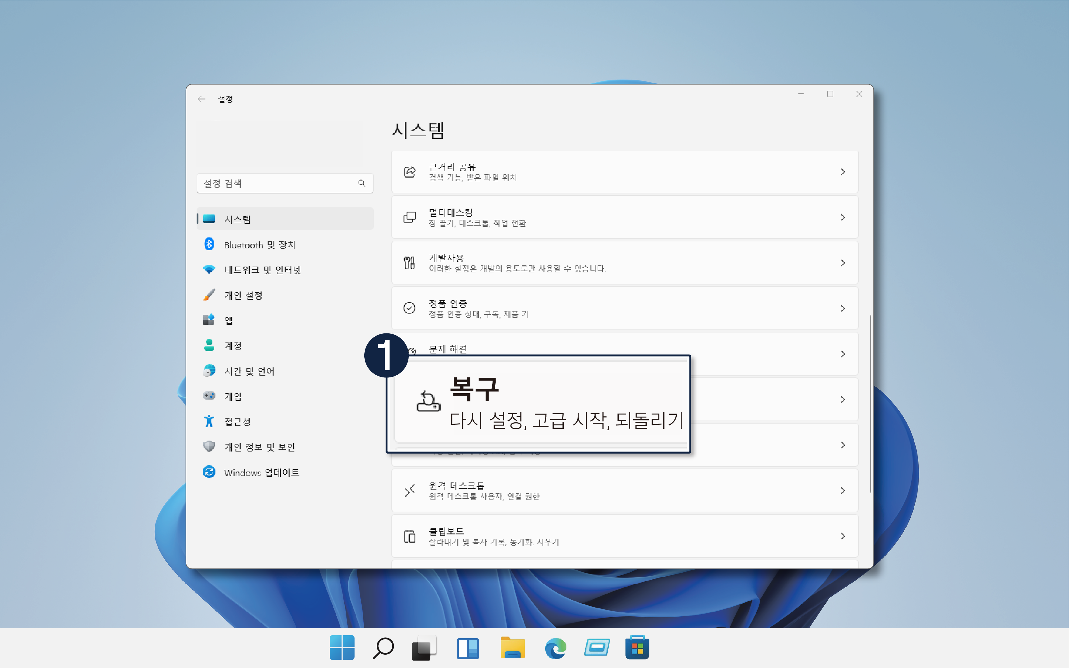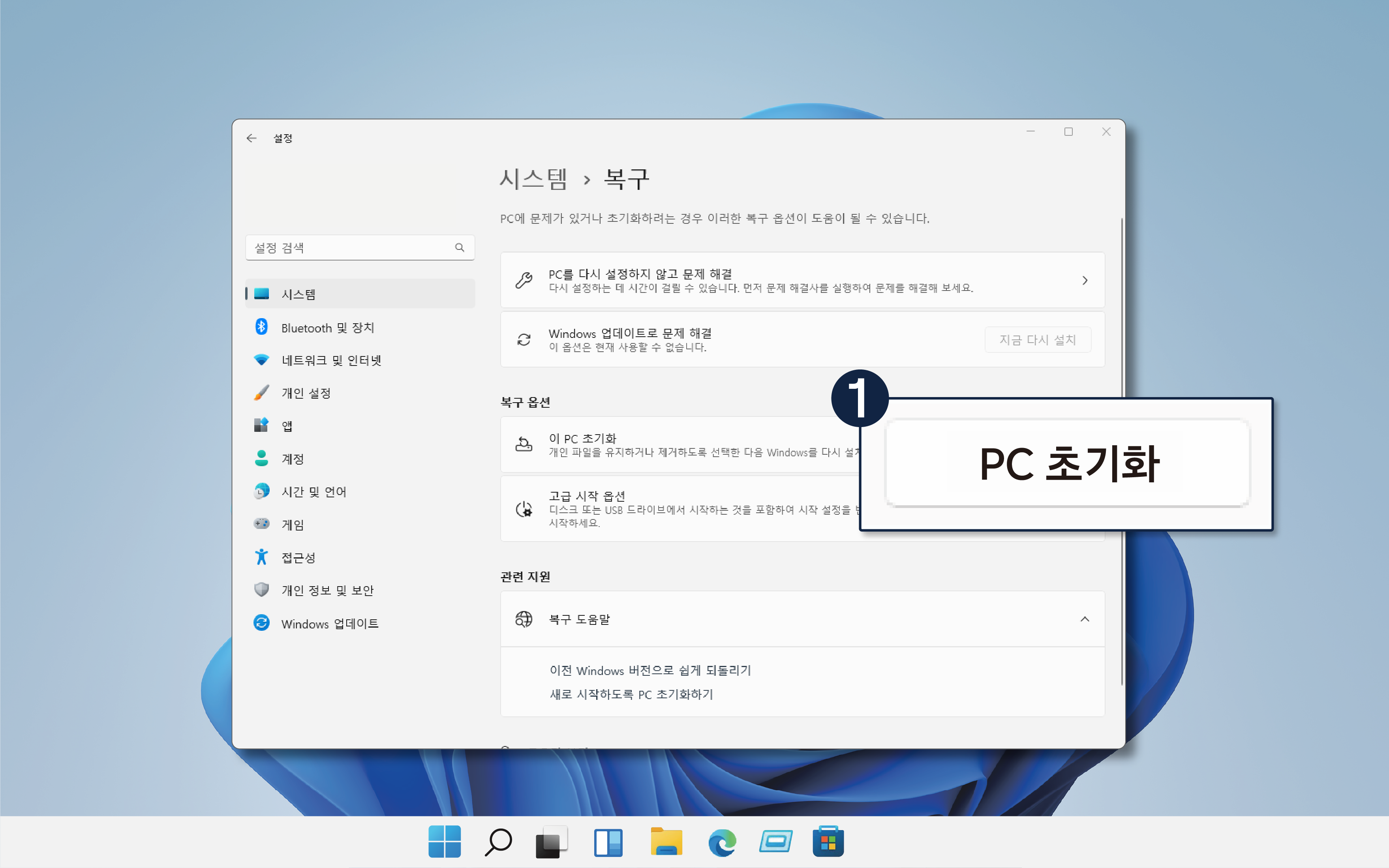 ① 'Windows 아이콘(시작) → 설정 → 시스템 → 복구 → PC 초기화' 를 클릭해 주세요.