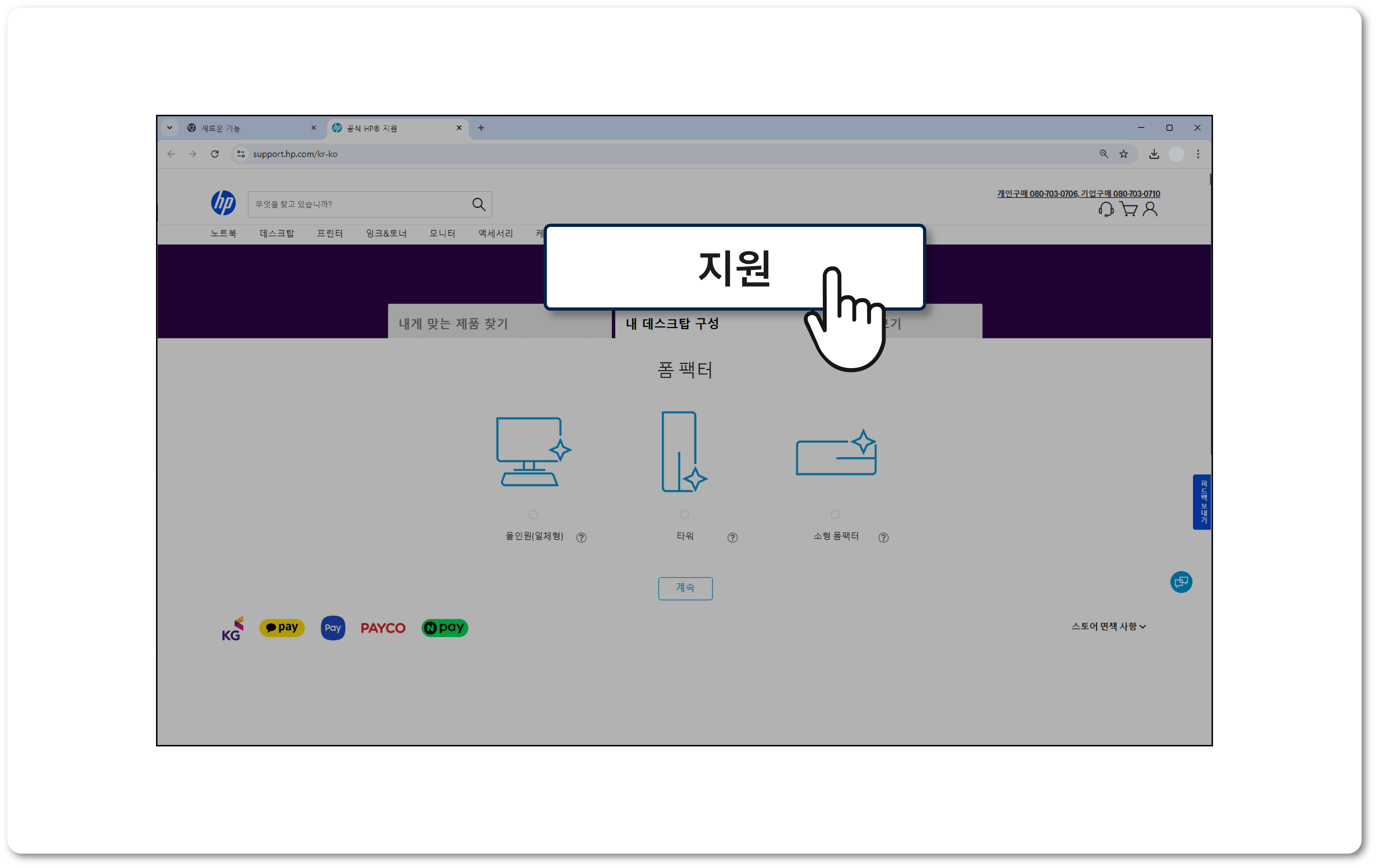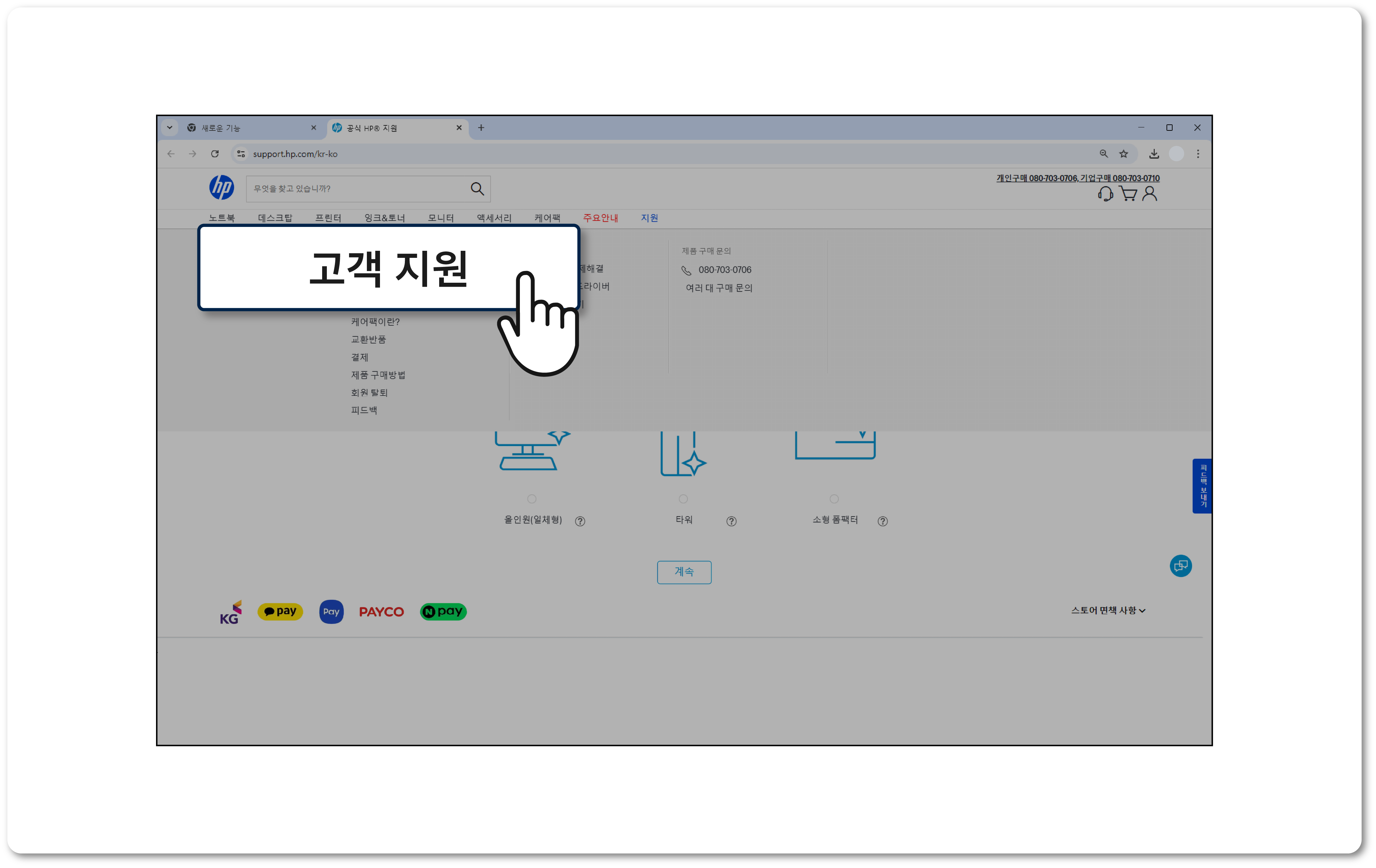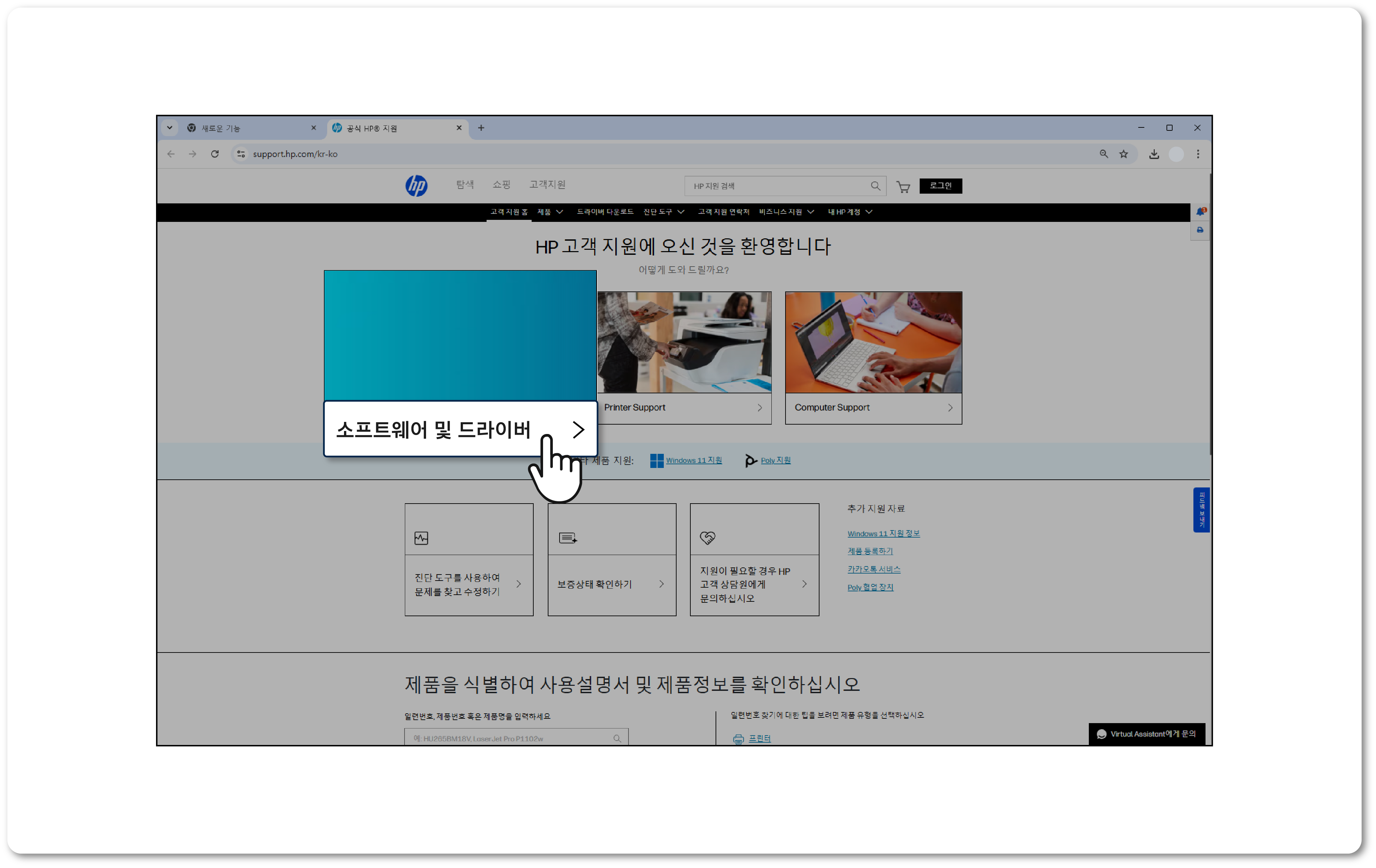 ① 여기(링크연결)를 클릭하여 HP 공식 고객센터로 들어가거나 검색창에 "HP 고객센터"를 검색해서 들어가 주세요.