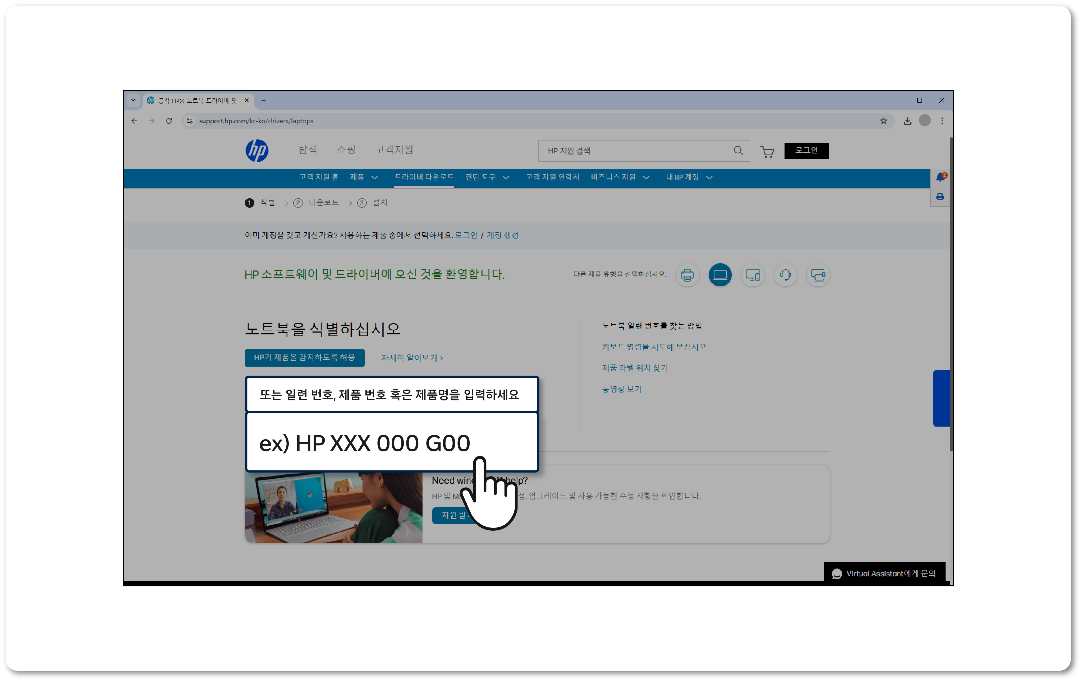 ③ 사용하고 있는 HP 노트북의 일련번호, 제품번호 혹은 제품명을 입력하여 검색된 제품명을 클릭해 주세요.