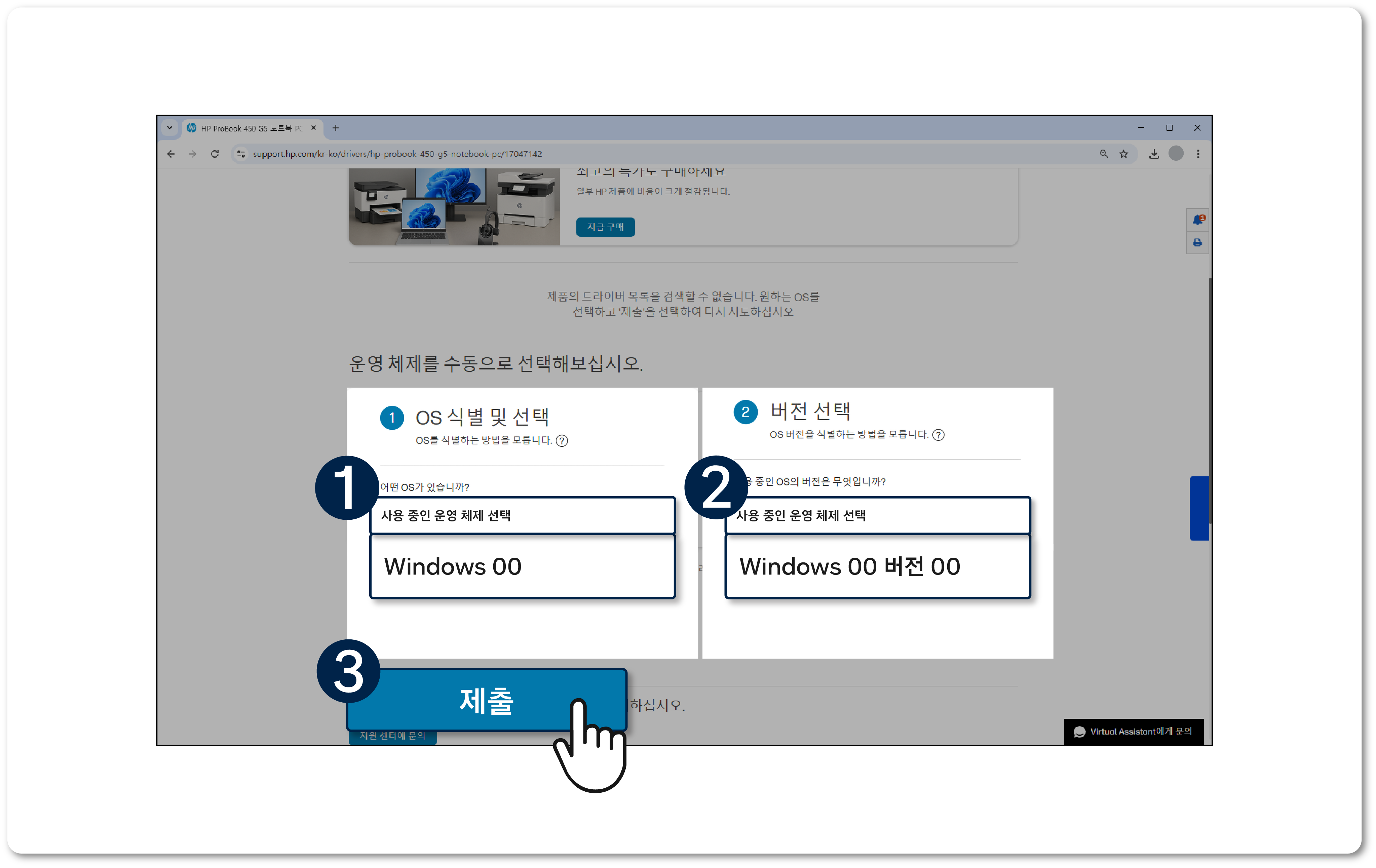 ④ 사용하고 있는 운영체제를 선택하고 검색된 목록에서 사용 중인 OS 버전을 선택한 후 제출 버튼을 눌러 주세요.
