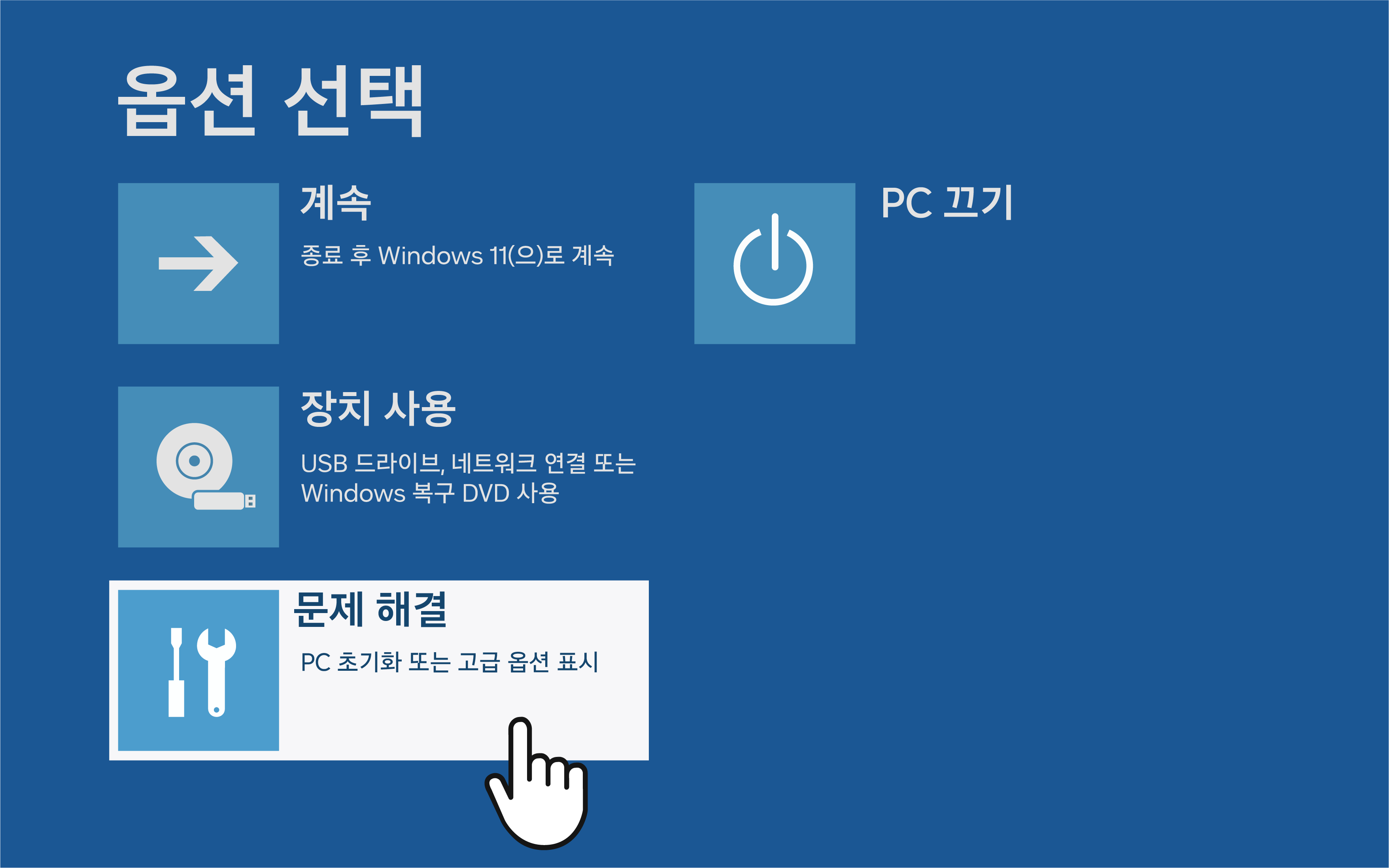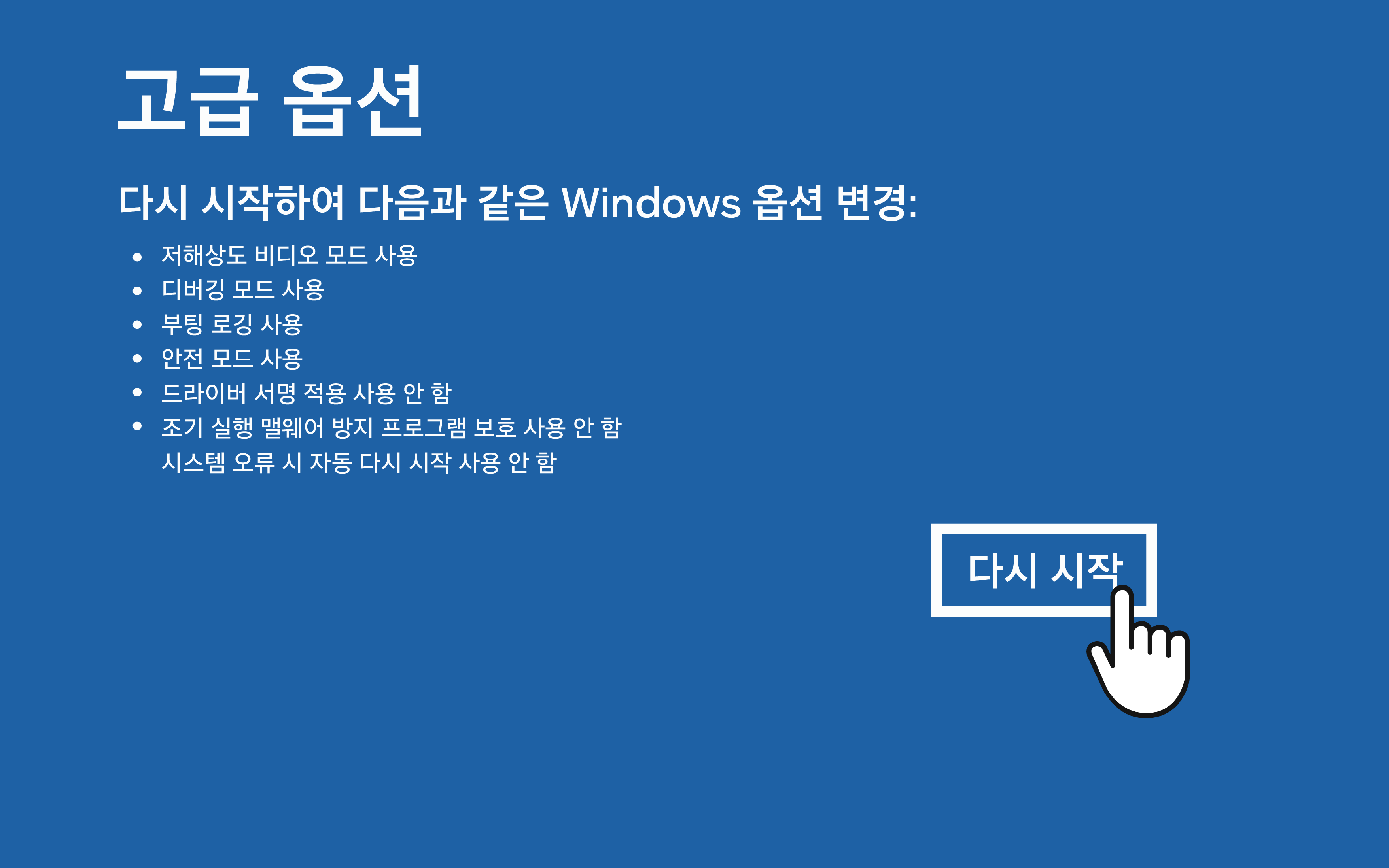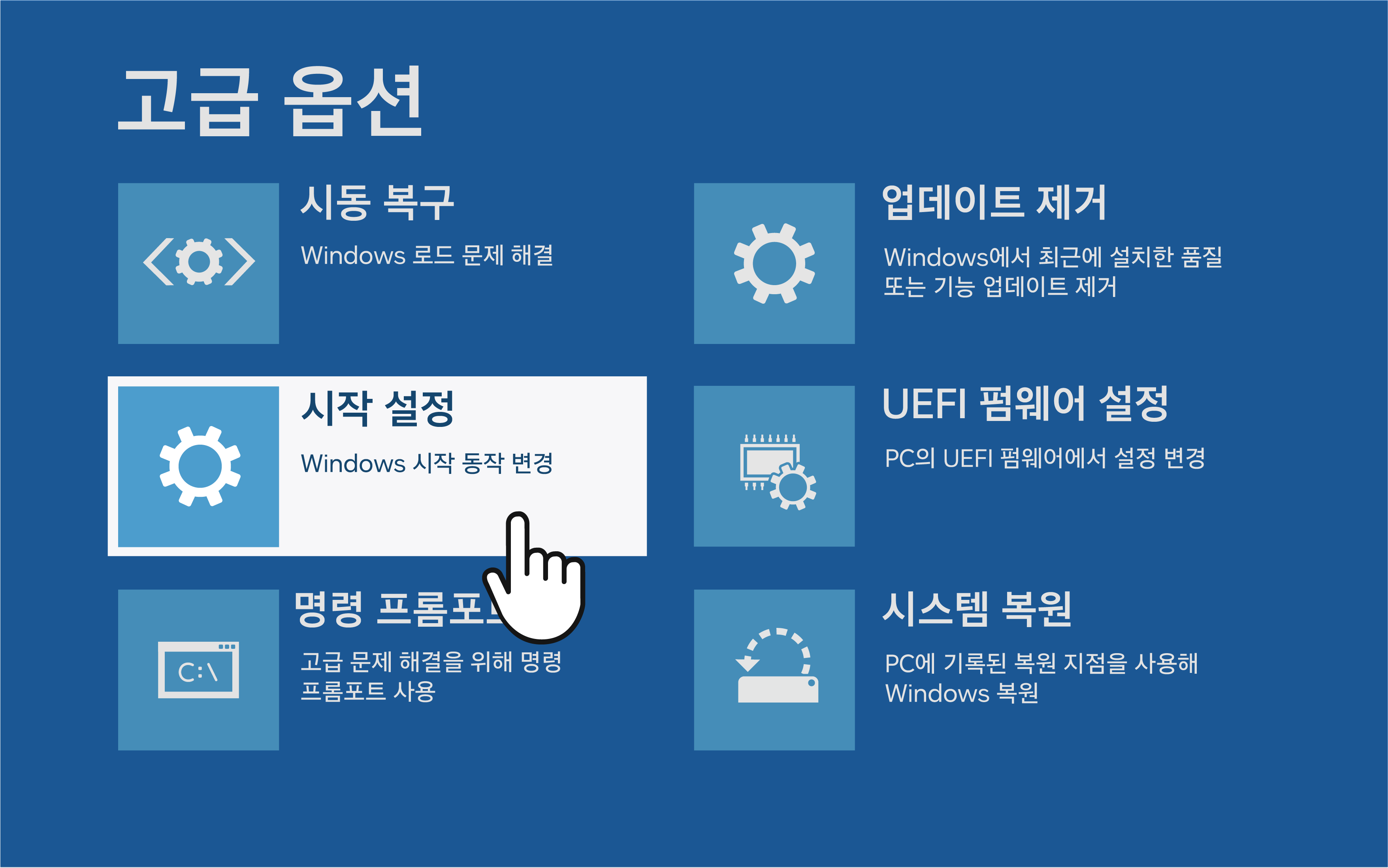 ② '문제 해결 → 고급 옵션 → 시작 설정 → 다시 시작 → 키보드의 4번을 입력' 을 진행해 주세요.