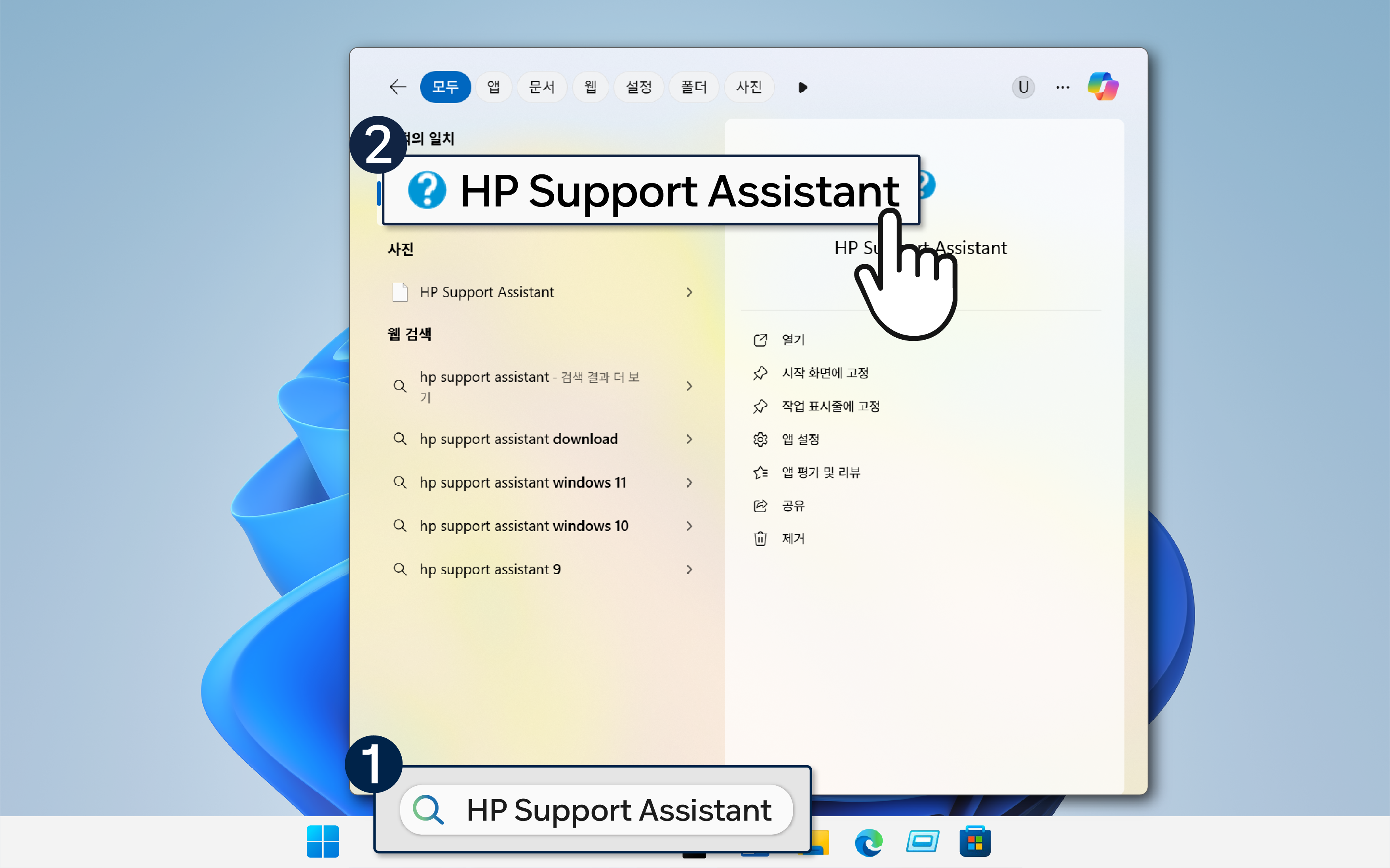 ① Windows 검색창에 HP Support Assistant를 검색하여 진입해 주세요.