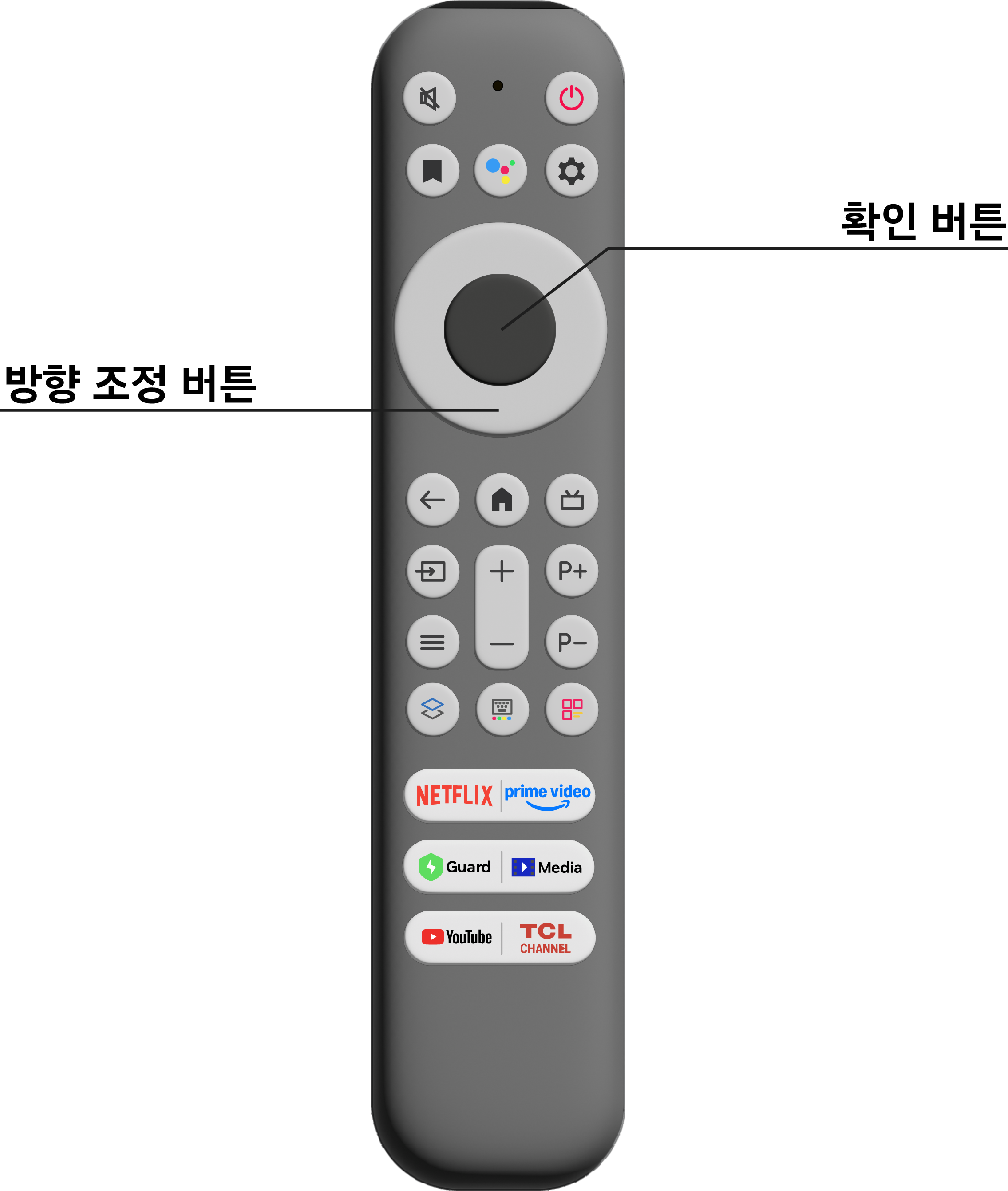 [TCL / iFFALCON TV] 리모컨 사용 방법 리모컨 살펴보기 : 음소거 버튼 : 대기모드 ON/OFF 버튼 : Google TV 홈에서 콘텐츠 즐겨찾기 저장 버튼 : 구글 어시스턴트와 대화를 위한 버튼 : TV 메뉴 설정 버튼 : 이전 메뉴로 돌아가거나 앱 종료 시 사용 : Google TV 홈 진입 버튼 : 프로그램 가이드 버튼 (동축케이블 또는 안테나 채널에서만 사용 가능) : 옵션 메뉴 버튼 : 볼륨 조정 버튼 : 채널 +버튼 : 채널 -버튼 : 퀵 패널 버튼 : 가상 키보드 팝업 버튼 : TCL 홈 접속 버튼 : 넷플릭스 연결 버튼 : 프라임 비디오 연결 버튼 : 어린이 보호 잠금 접속 버튼 : 미디어 플레이어 접속 버튼 : 유튜브 연결 버튼 : TCL 채널 접속 버튼 리모컨은 모델별로 디자인 및 기능이 다를 수 있으며, 일부 모델에서는 특정 기능을 사용할 수 없습니다. 외부 입력 진입 및 TV 설정을 변경하고 싶다면 TCL/iFFALCON TV 리모컨으로 조작이 필요합니다. TV 리모컨이 아닌 셋톱박스용 리모컨 같은 다른 리모컨을 사용할 경우, 일부 기능의 진입이 어렵습니다. 외부 입력 진입이 불가하거나 TV 설정 메뉴 진입 등이 안 되는 경우 사용 중인 리모컨이 TV 리모컨이 맞는지 확인해 주세요. 만약 문제가 해결되지 않는다면 쿠팡 A/S 기술 지원센터로(1577-2420) 도움을 요청하세요. 관련 문서 32D3100 사용설명서 [TCL / iFFALCON TV] 전원이 꺼지지 않아요. ▶️ [TCL iFFALCON TV] OTT, PC, USB 등 사용시 화면 색상이 이상하고 노이즈가 생겨요. [TCL / iFFALCON TV] 자동 꺼짐이나 취침 예약을 설정하고 싶어요.▶️ [TCL / iFFALCON TV] 앱 사용 방법을 알고 싶어요.▶️