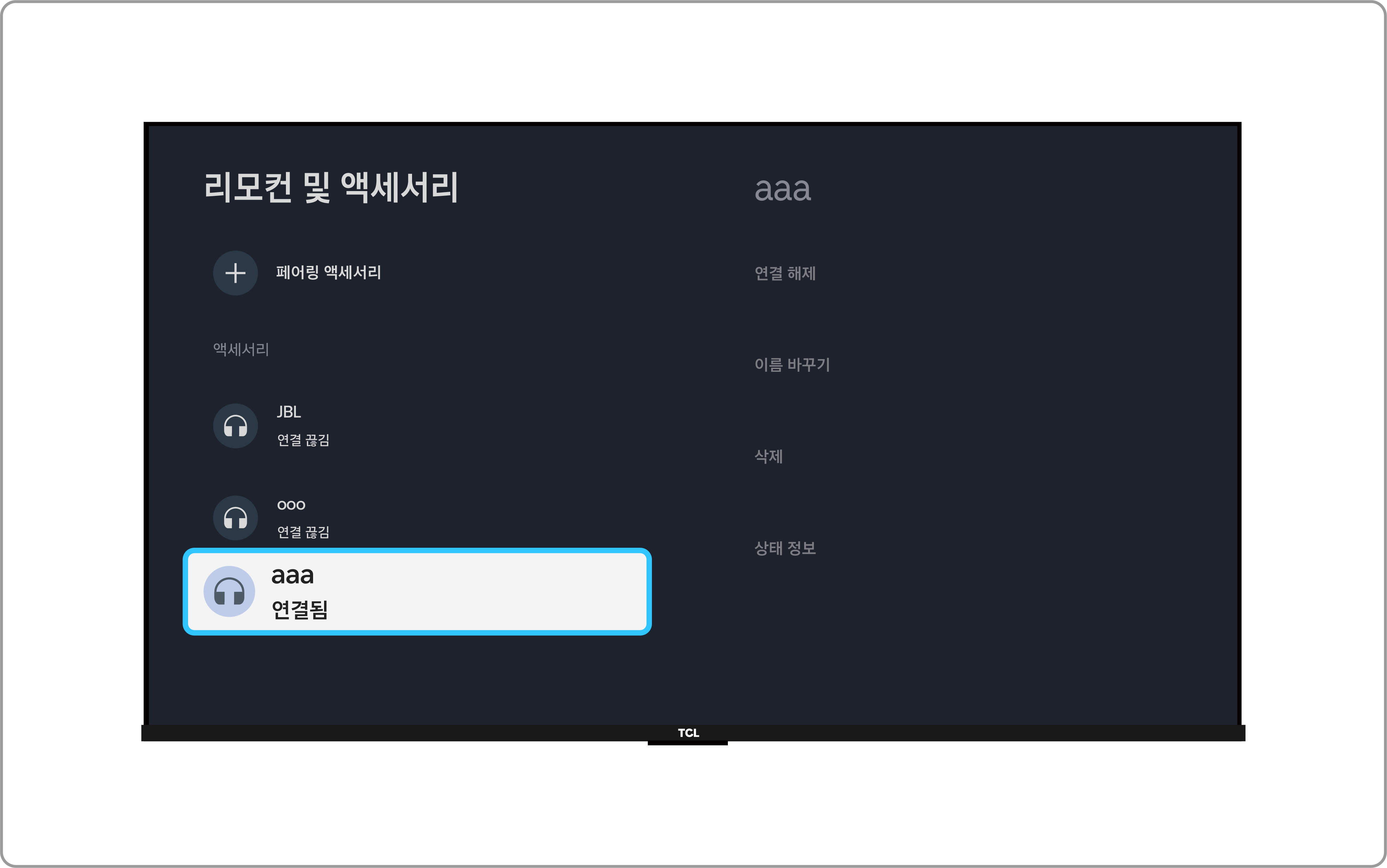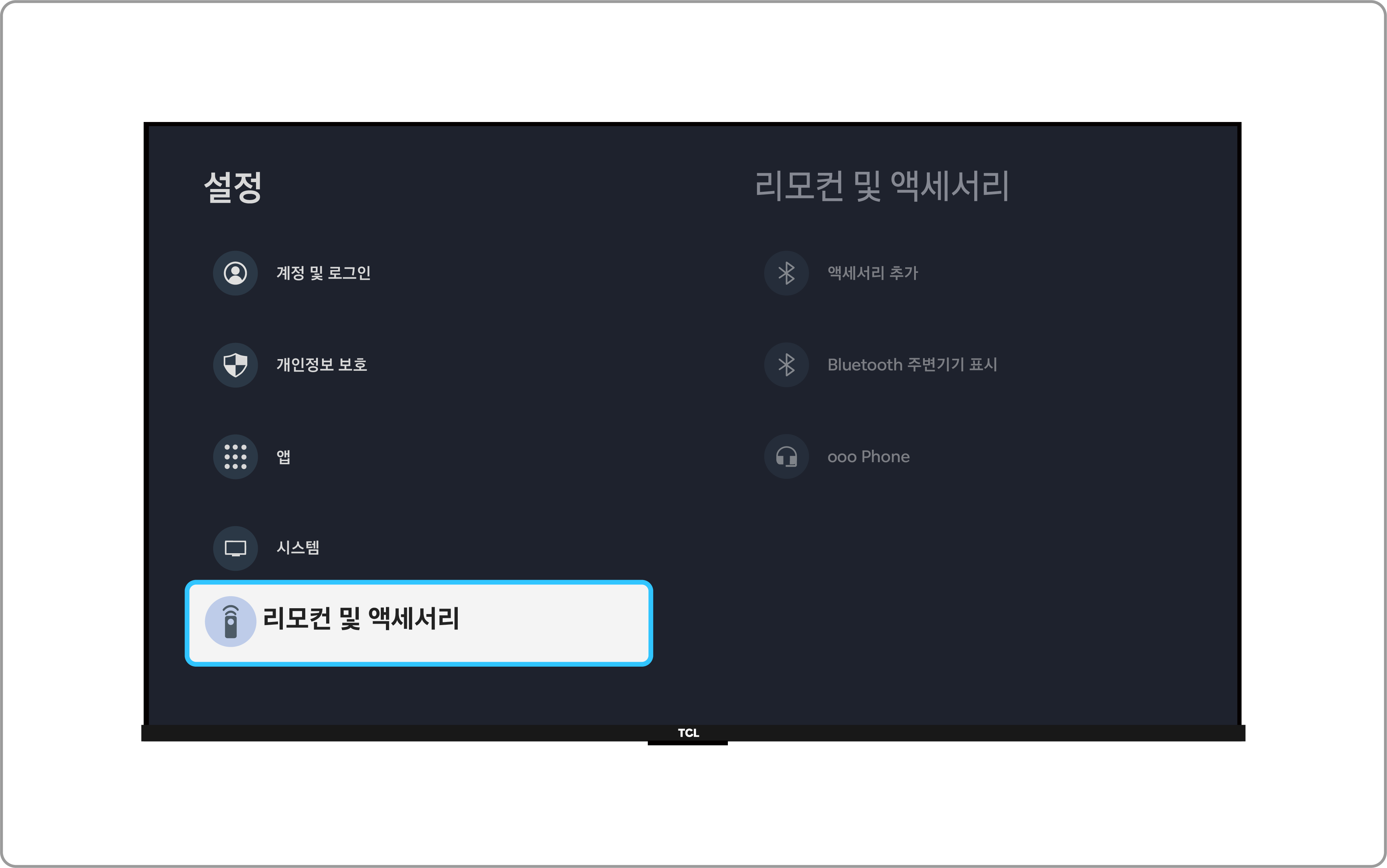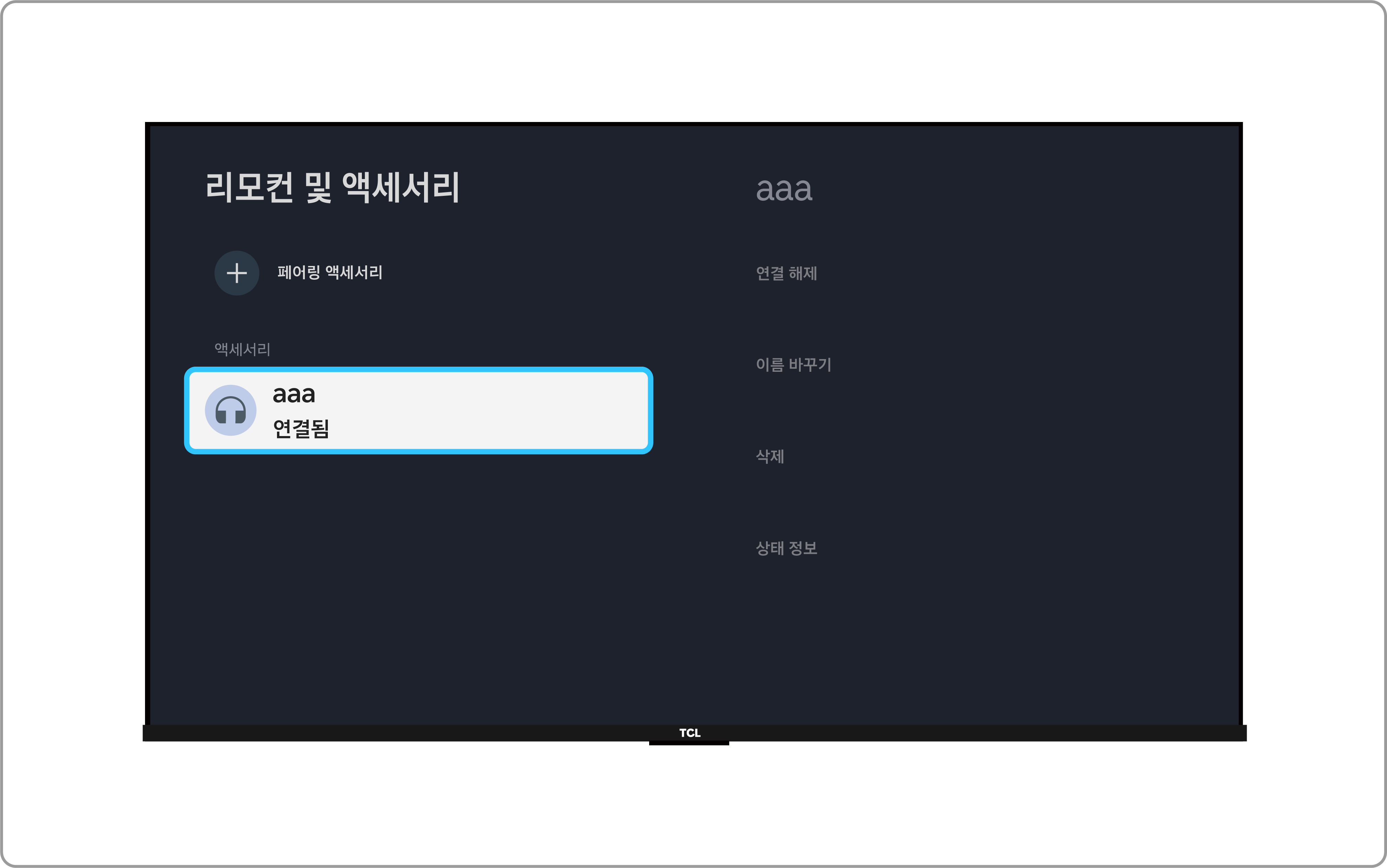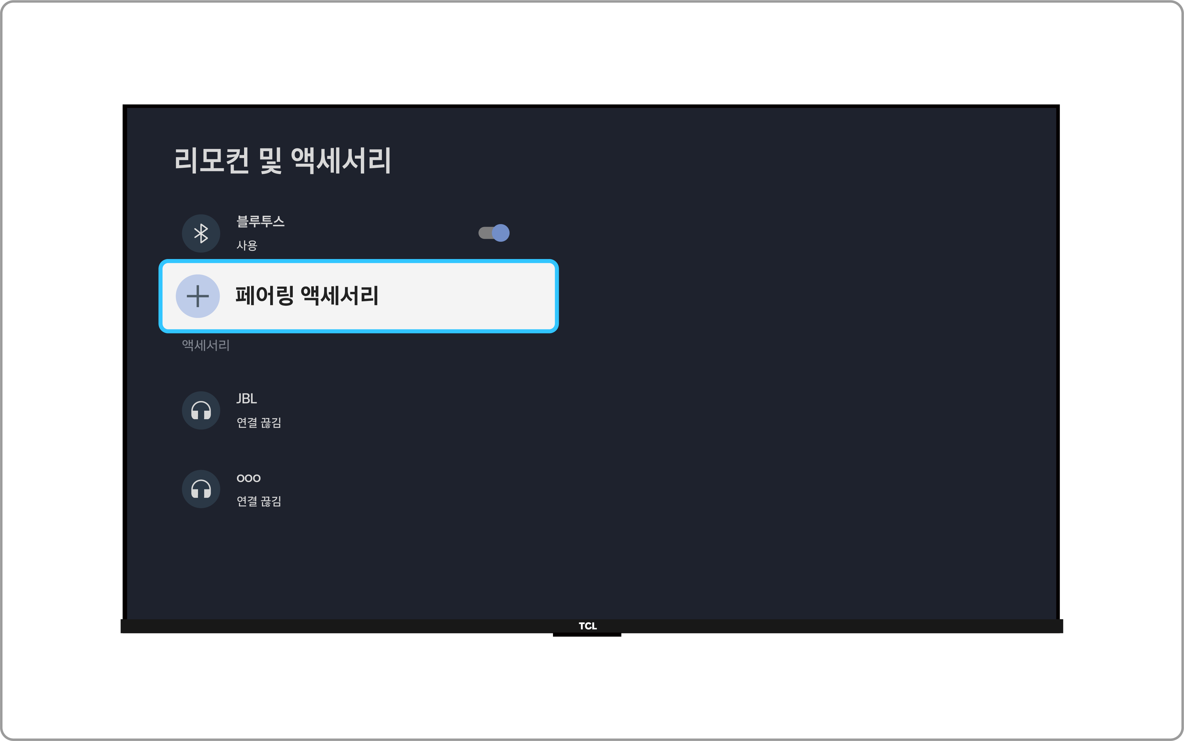 • 리모컨 설정(⚙️) → 대시 보드 설정(⚙️) → 리모컨 및 액세서리 → 기기 선택