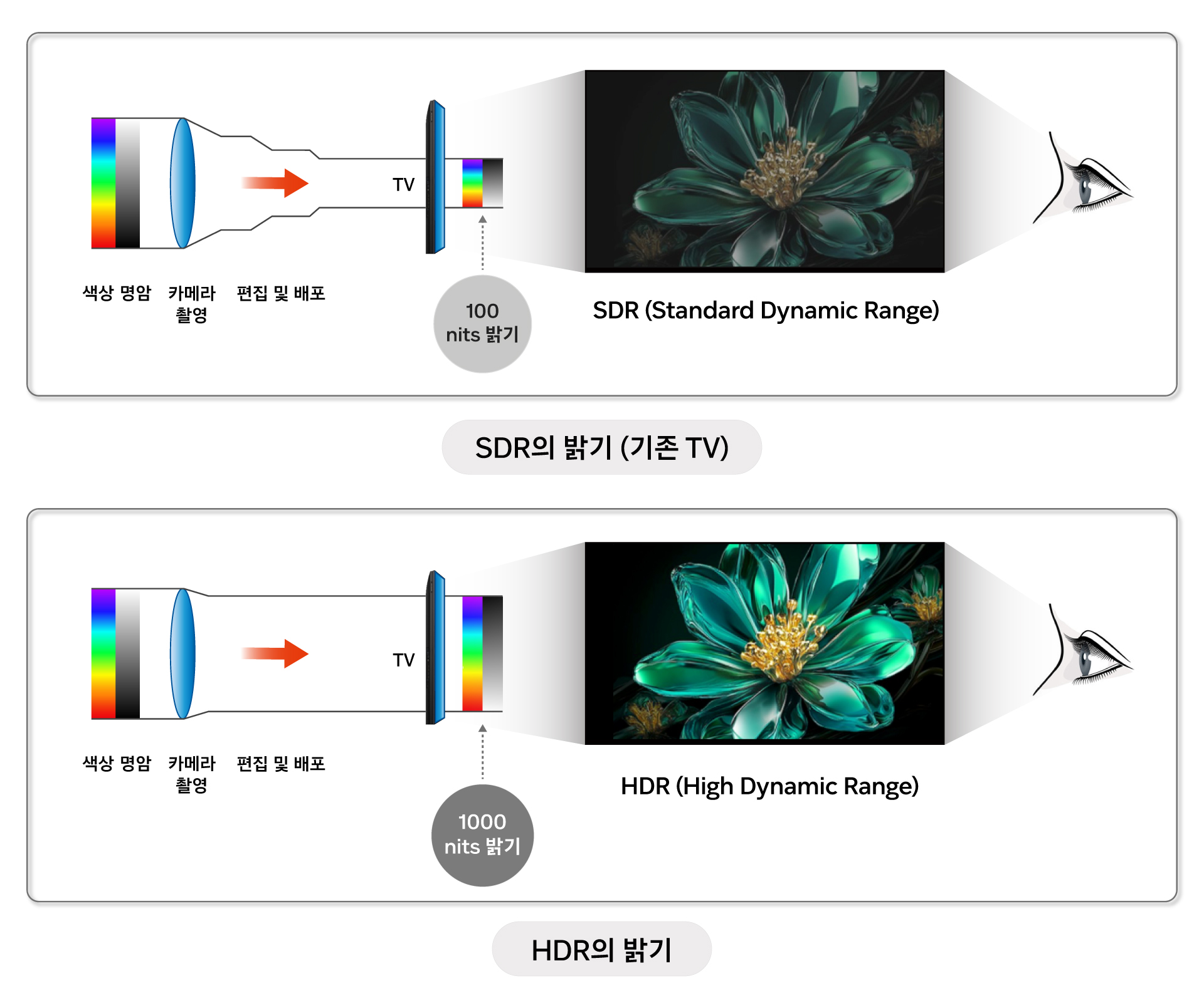 • 예를 들어, 어두운 장면 속에 있는 꽃이 HDR기술이 적용되면 꽃의 질감은 물론, 모양과 컬러까지 실감나게 화면에 표현되어 선명하게 꽃을 볼 수 있습니다.