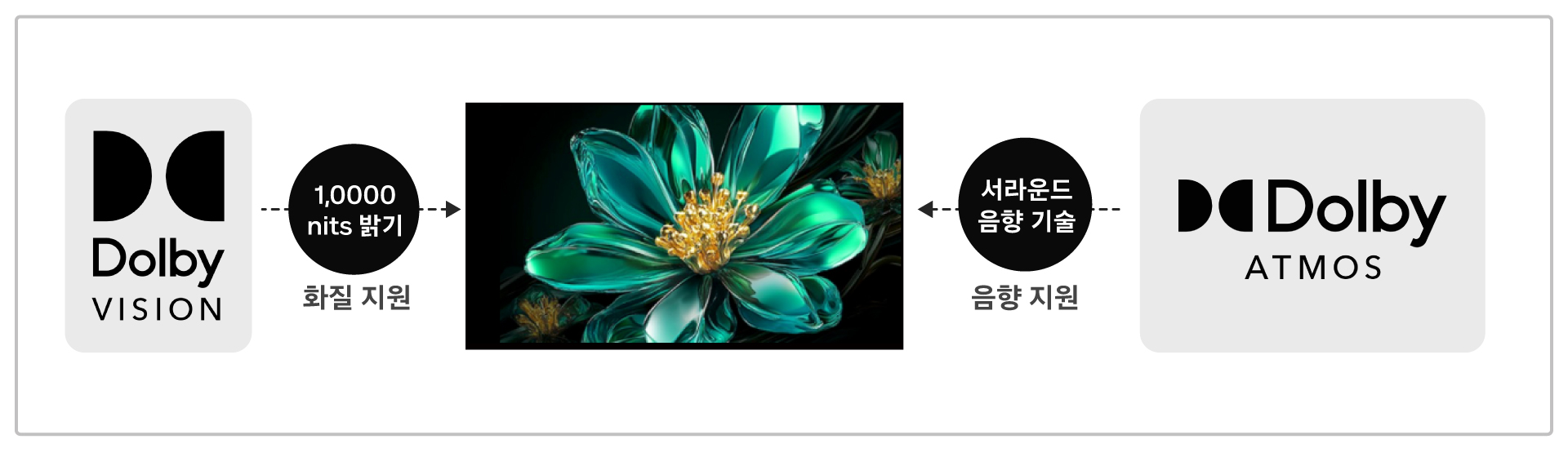 • 돌비의 '서라운드 음향 기술'이라고 하며 가상 공간을 설정하여 소리가 특정위치에서 구현되도록 하여 TV의 음향을 지원하는 기술입니다.