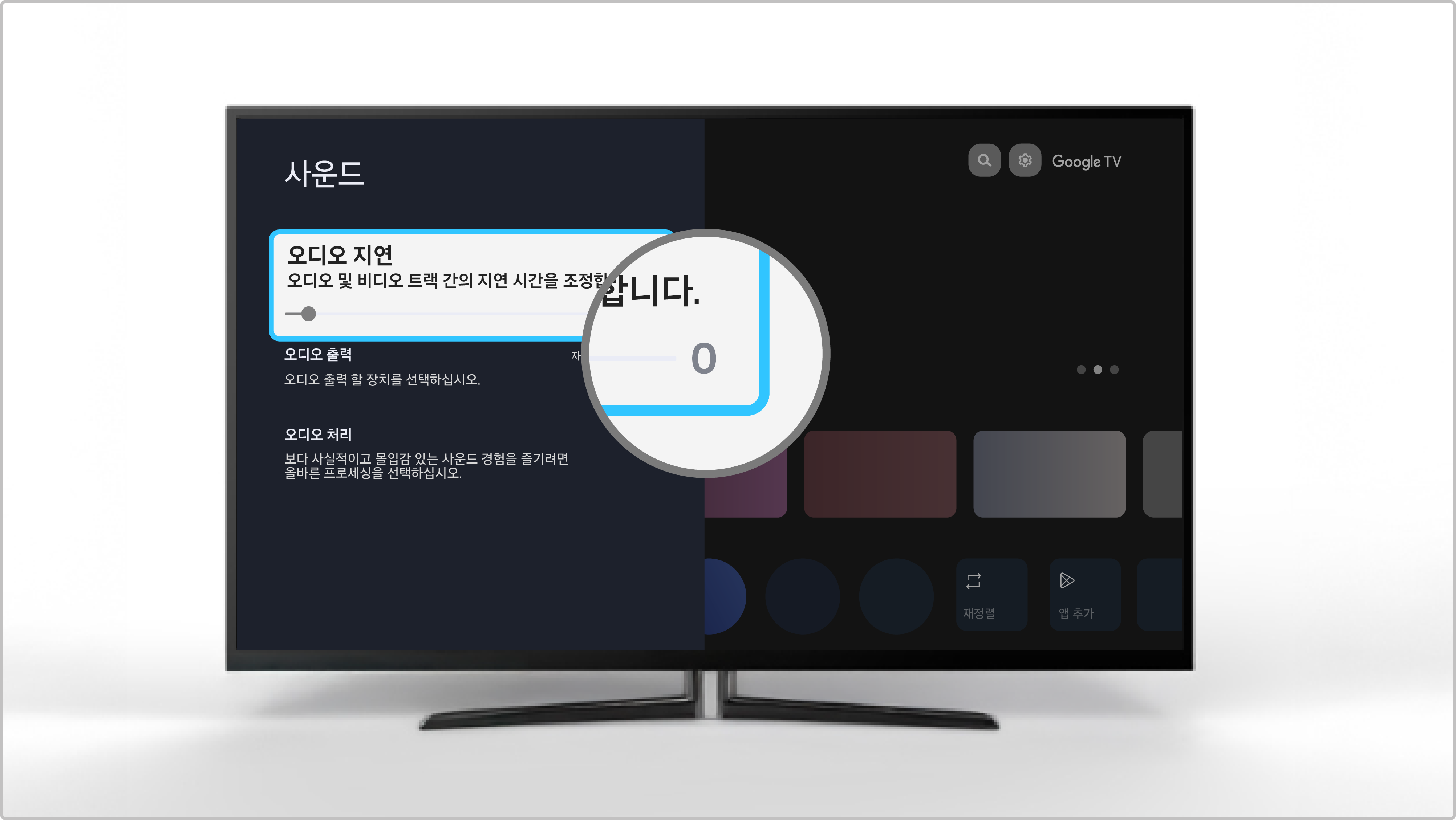 리모컨 설정(⚙️) → 대시 보드 설정(⚙️) → 화면 및 소리 → 사운드 → 오디오 지연 설정