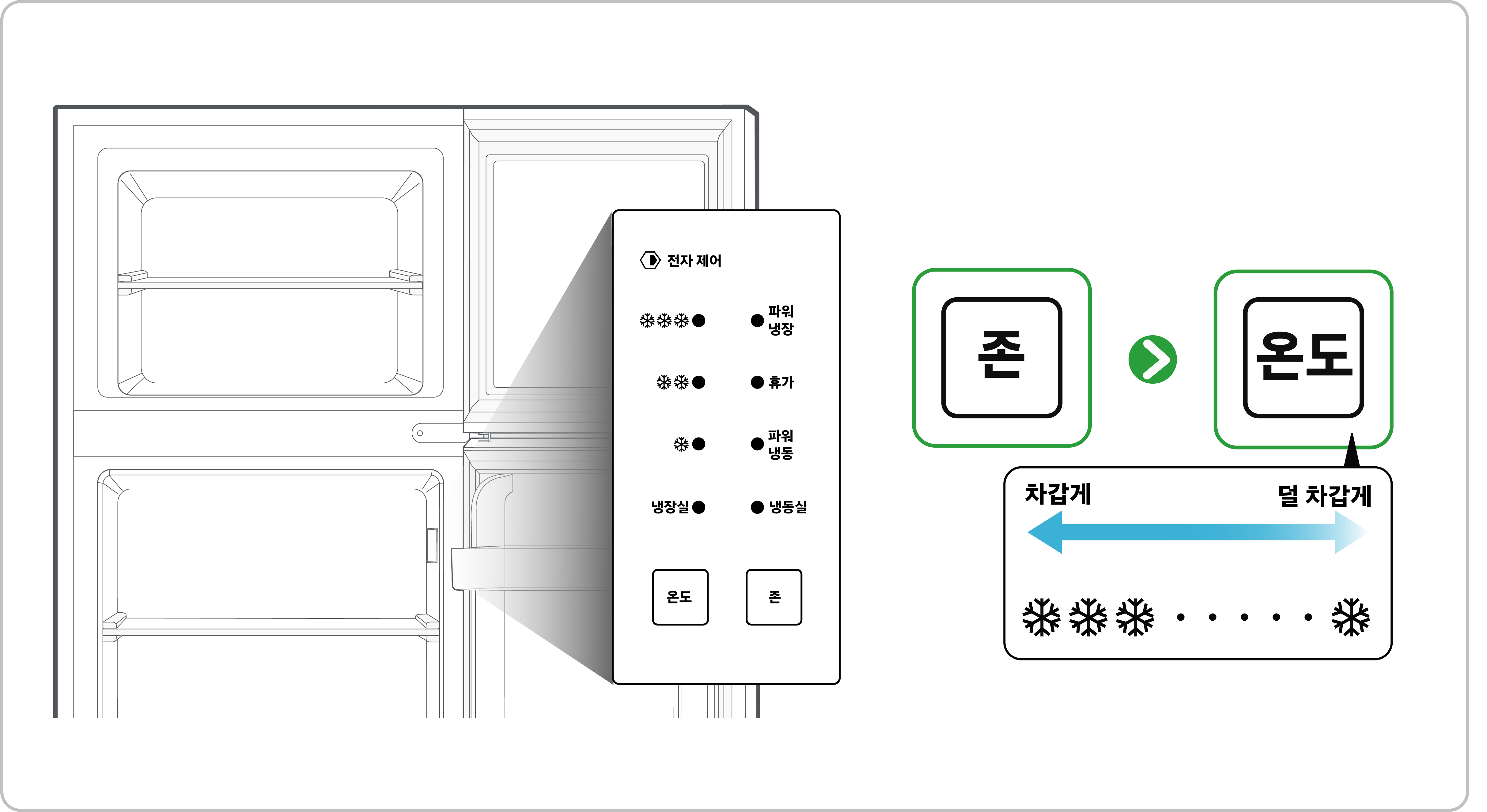 2. 냉장실과 냉동실 온도 설정은 눈꽃 아이콘이 3개(높음), 2개(중간), 1개(낮음), 파워 냉장, 휴가, 파워 냉동 사이를 순환합니다. 눈꽃 아이콘이 많을수록 차가우며, 급속 냉장 및 냉동이 필요할 경우 파워 냉장, 냉동을 선택해 주세요.