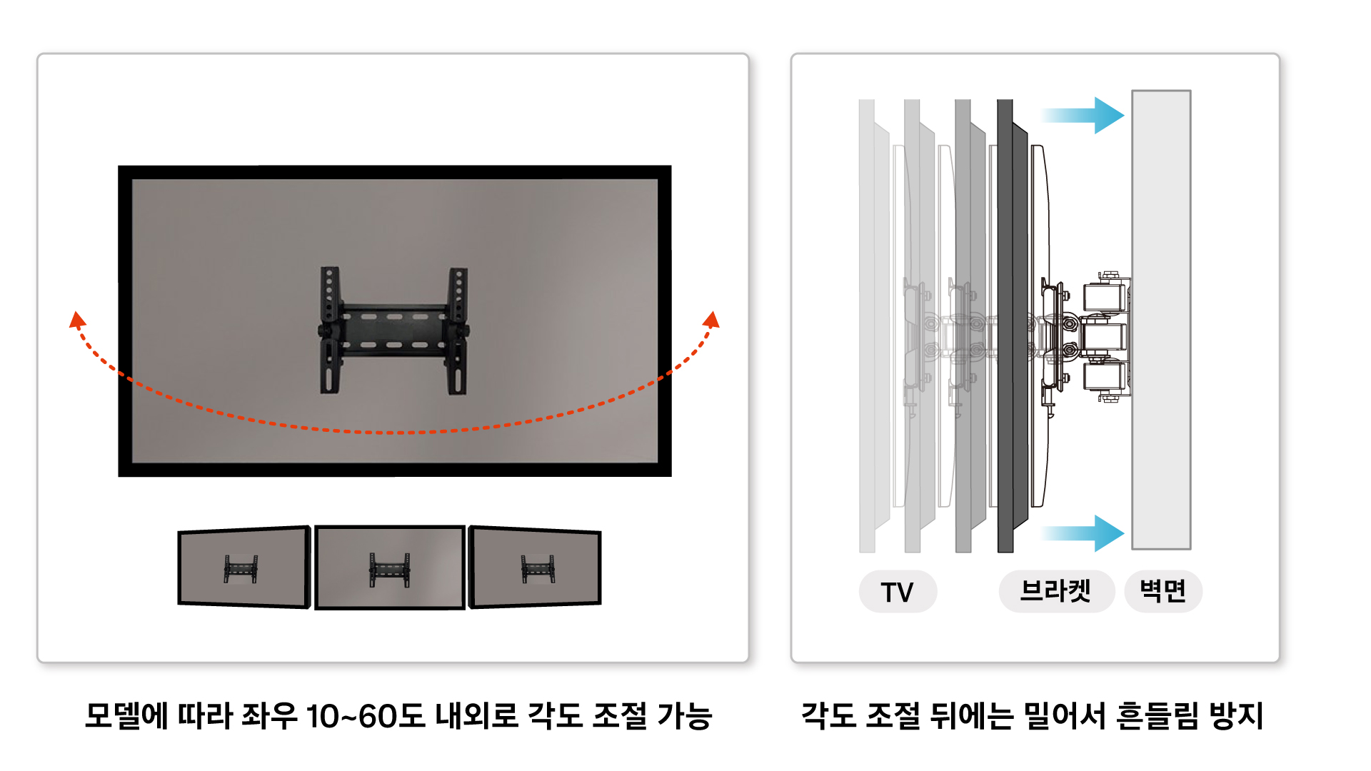 • 단, 브라켓 종류에 따라 각도 조절 여부가 다를 수 있으며 일부 모델은 각도 조절이 불가능할 수 있습니다.