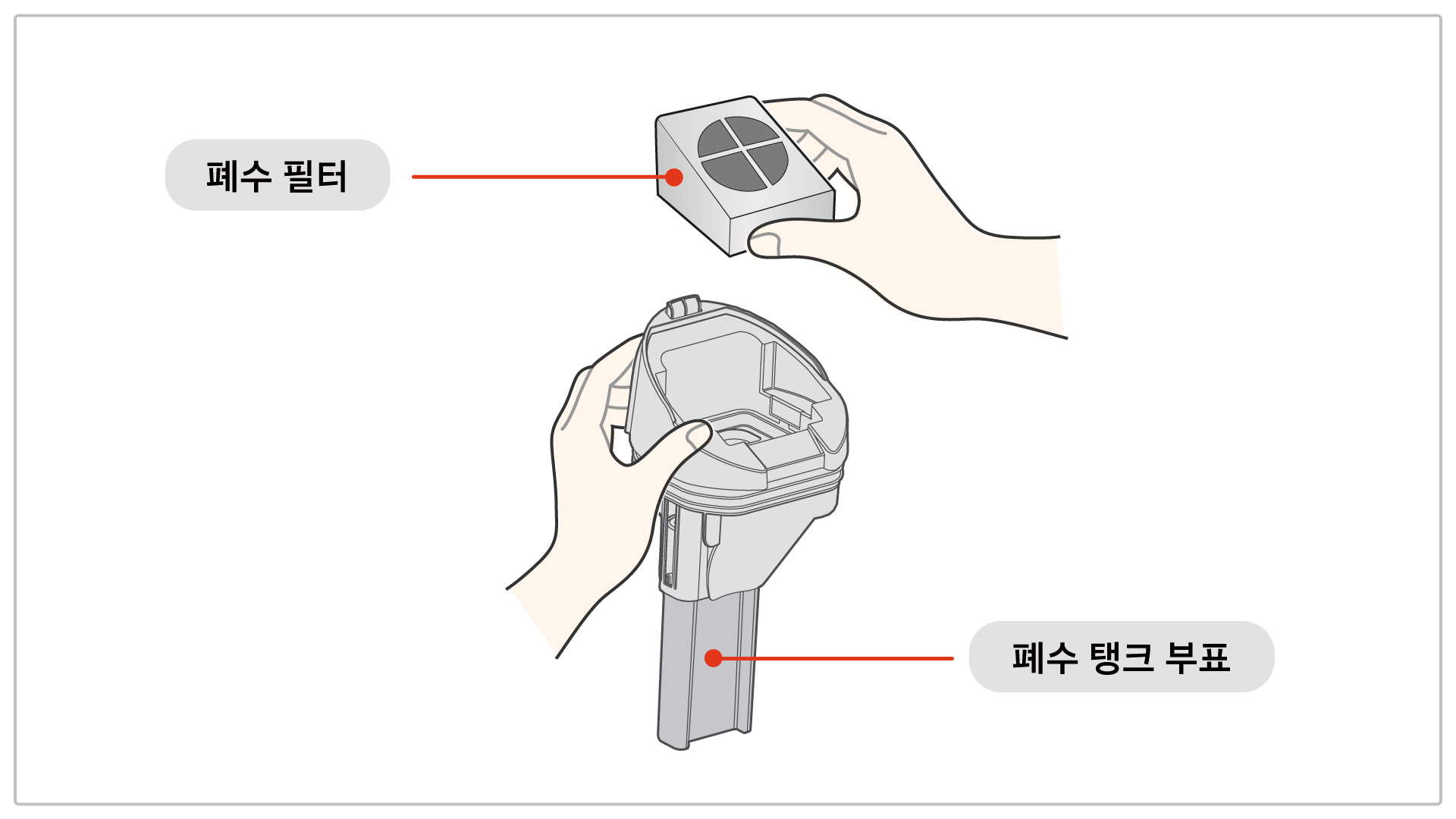 1. 한 손으로 폐수 탱크의 버튼을 아래로 누르고, 다른 손으로 동시에 탱크를 당겨서 부품을 분리해 주세요.