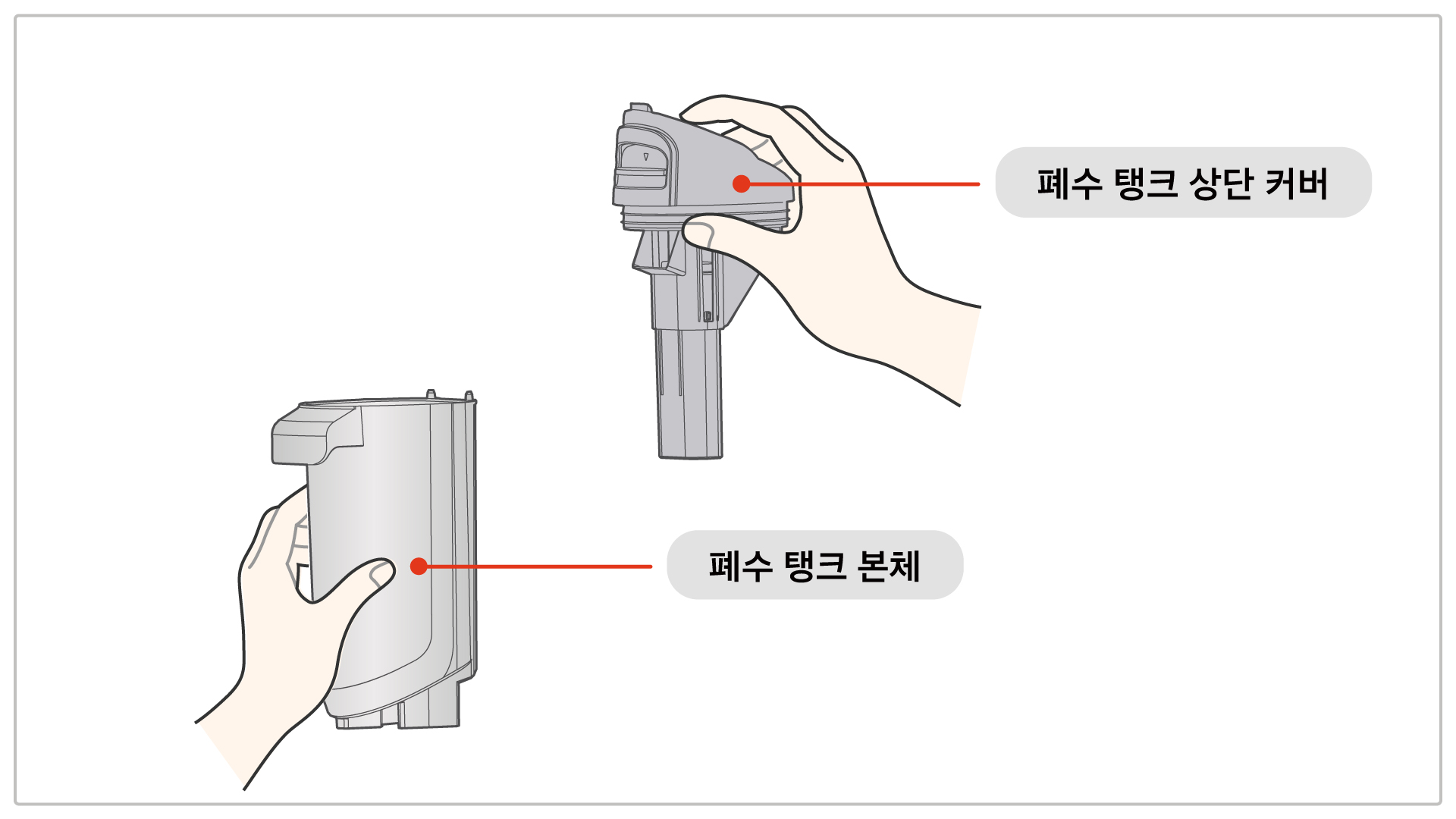 1. 한 손으로 폐수 탱크의 버튼을 아래로 누르고, 다른 손으로 동시에 탱크를 당겨서 부품을 분리해 주세요.