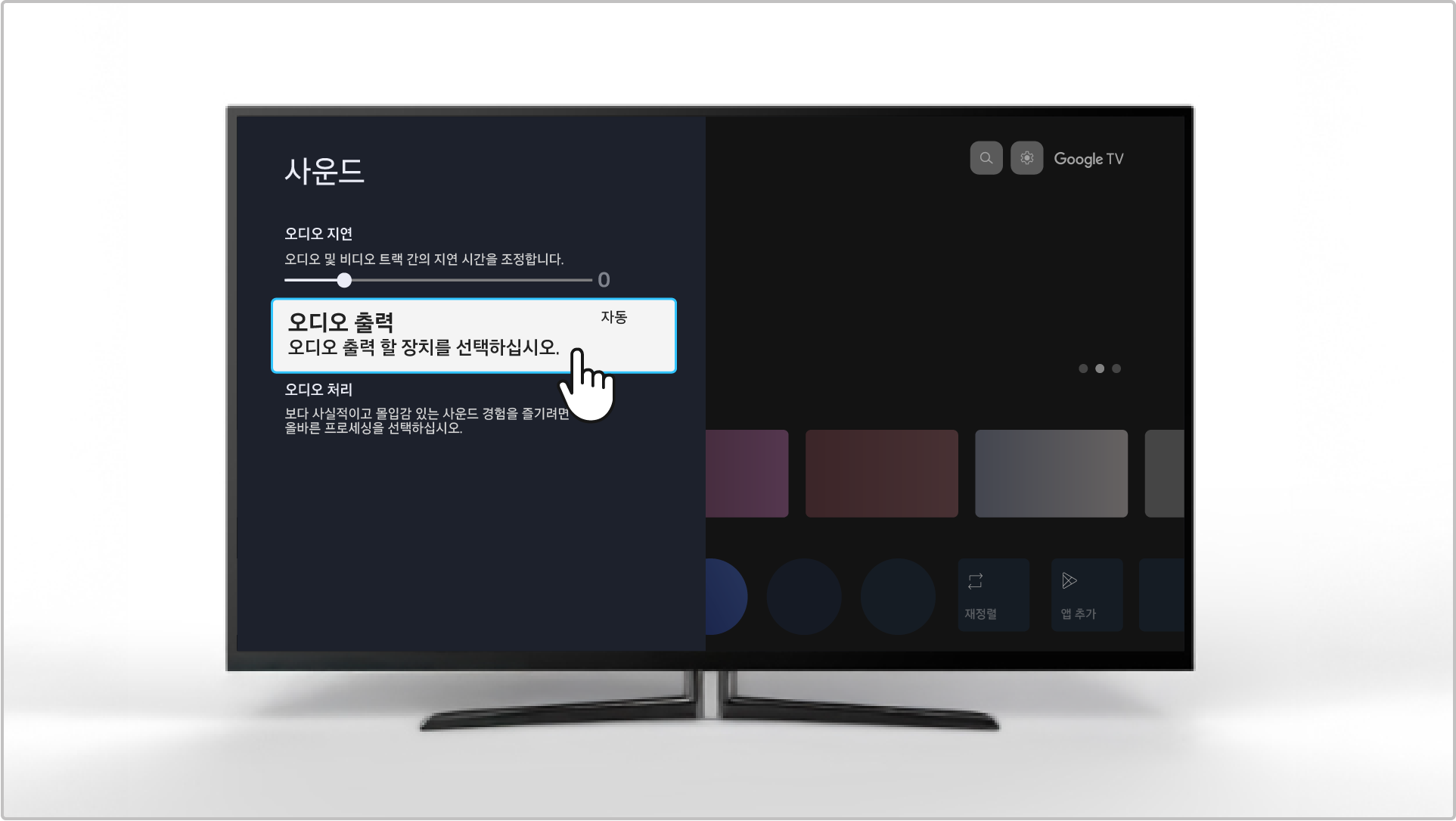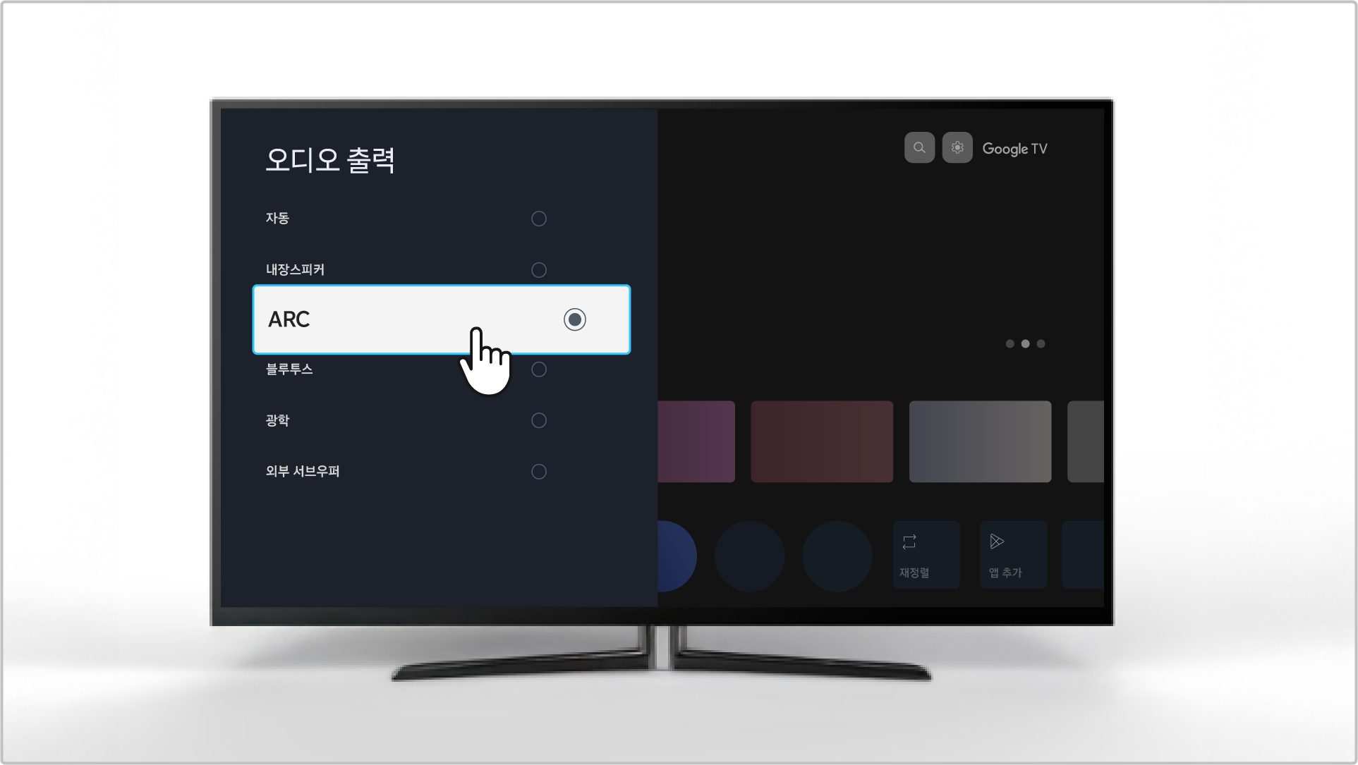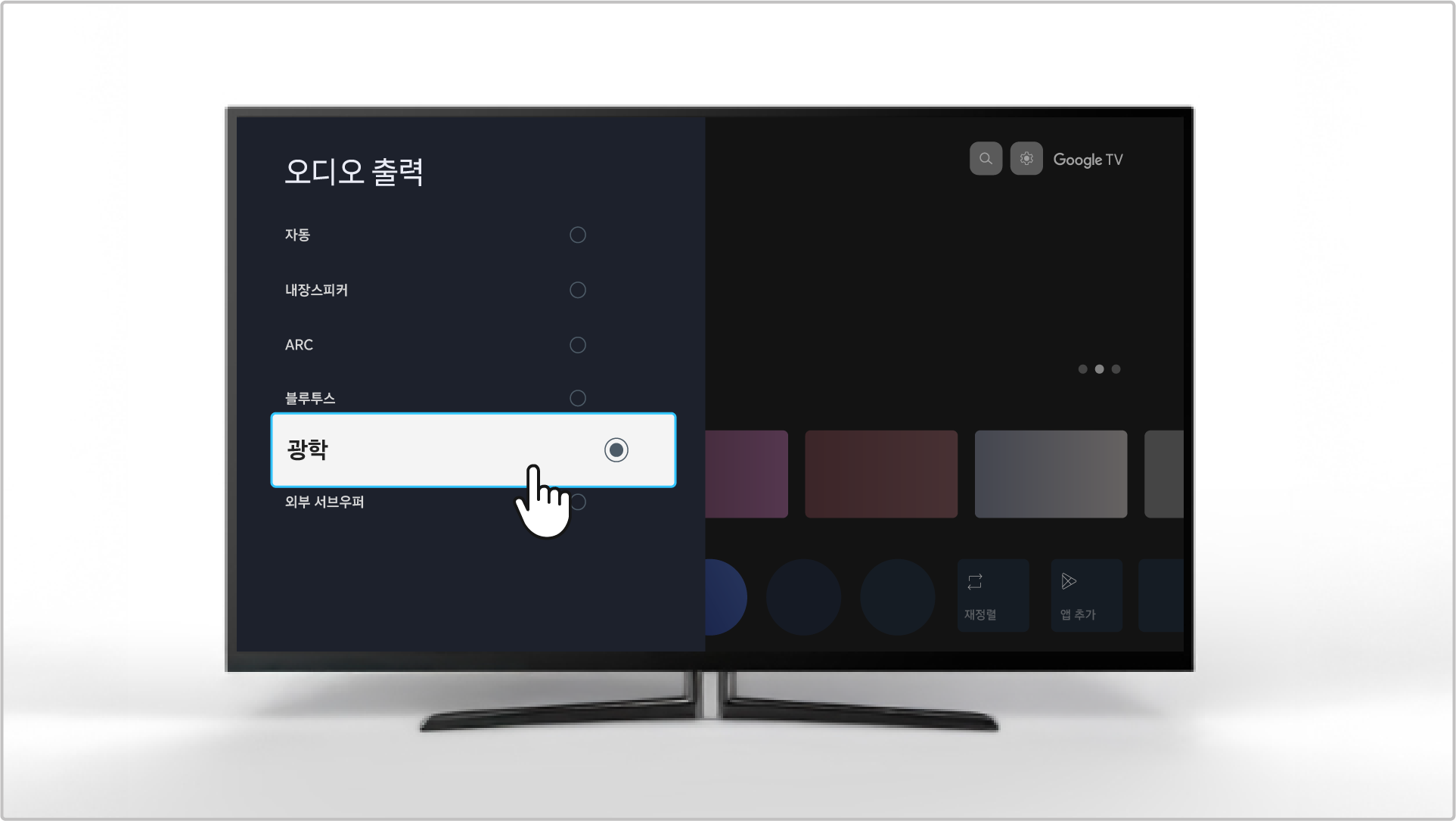 • 구글 홈 화면 → TCL 리모컨 설정(⚙️) → 리모컨 확인 버튼 클릭 → 대시 보드 설정(⚙️) → 화면 및 소리 → 오디오 출력 → 내부 스피커 → 사운드바(HDMI) 또는 광학