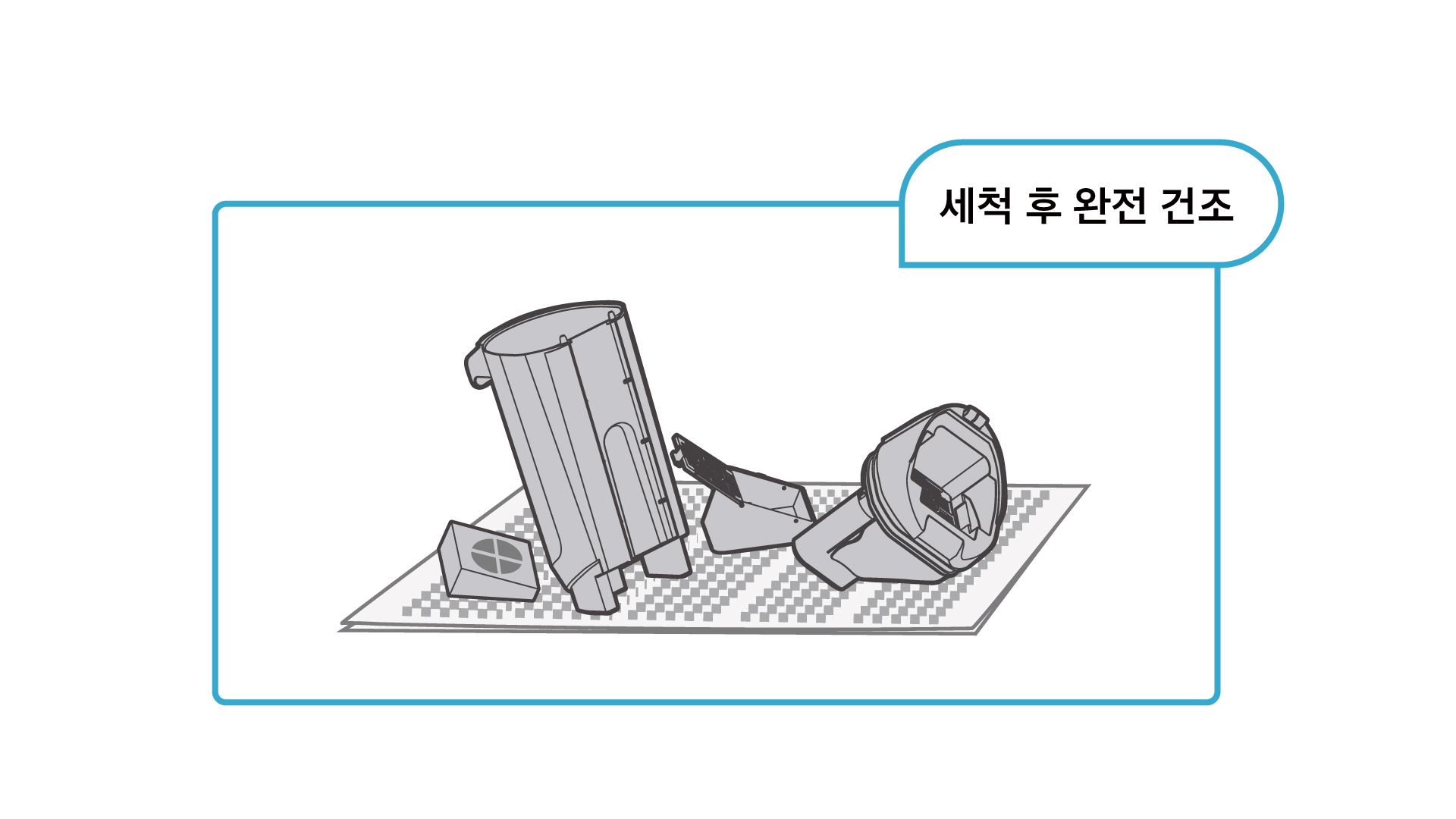 • 청소기 필터 세척 후 완전 건조 후 장착해야 하며 건조하지 않고 장착 시 습기로 인해 제품 고장이 발생할 수 있습니다.