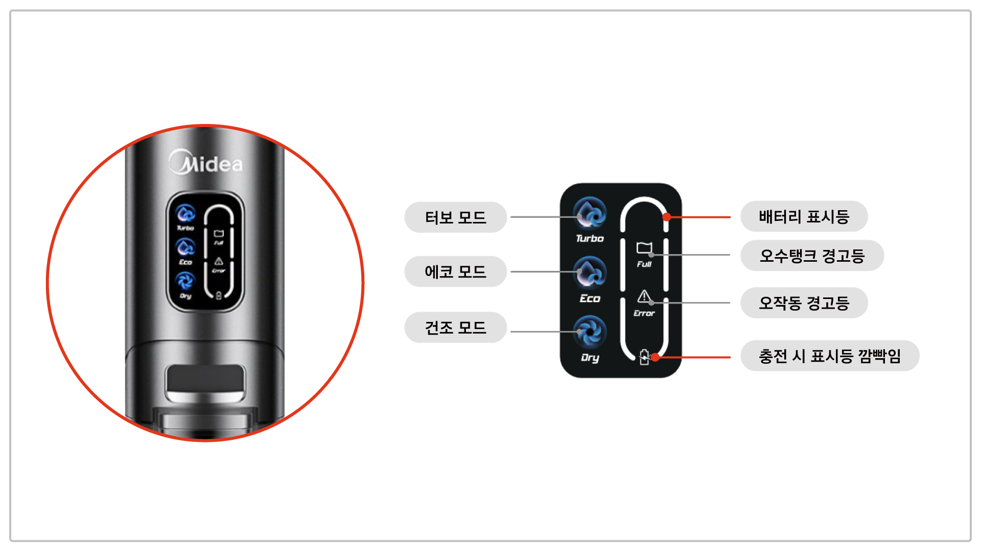 • 핸디스틱 청소기의 배터리 충전률이 낮을 시에 흡입력이 약해지며 배터리 표시등이 깜빡일 수 있습니다.