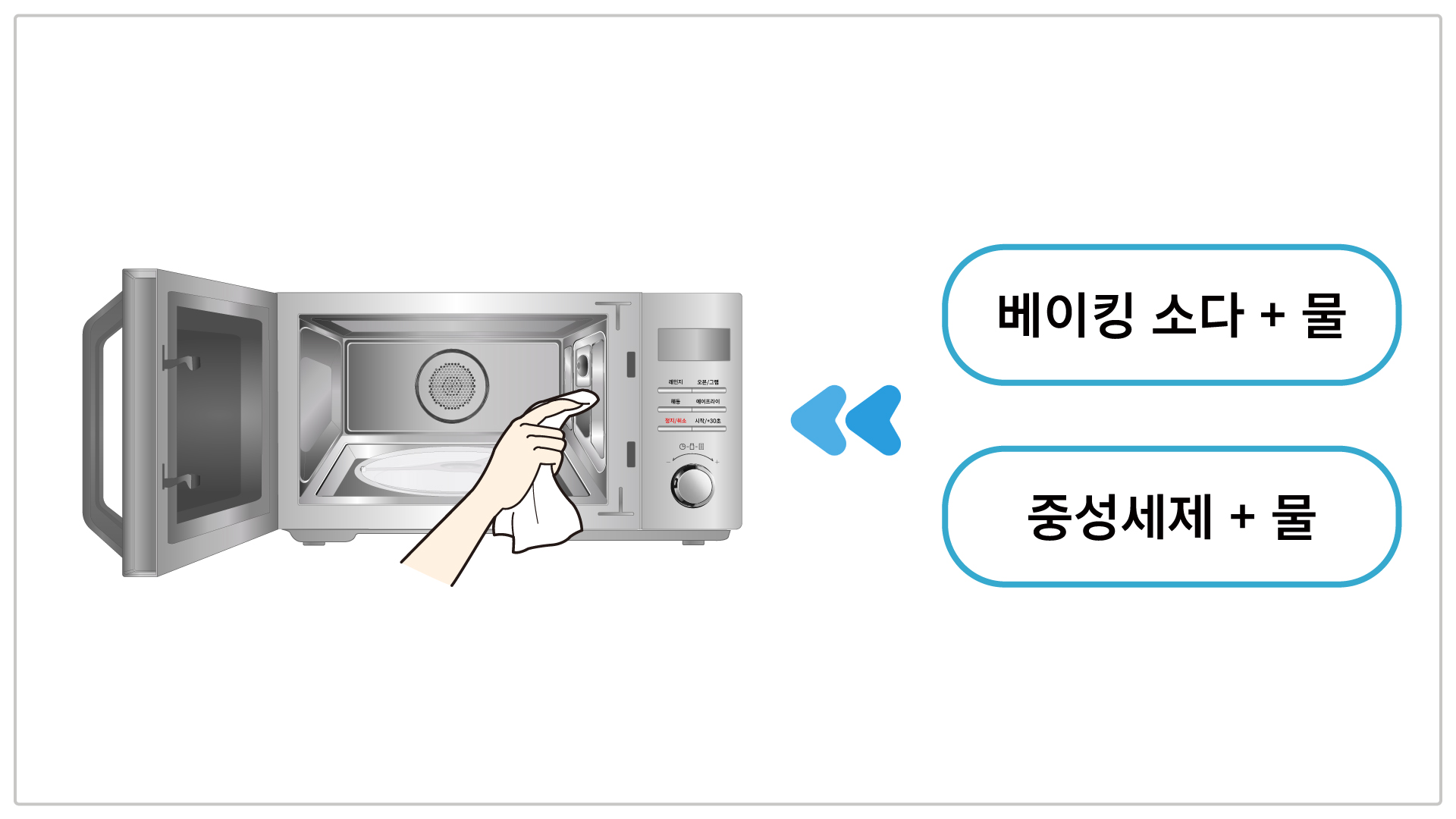 • 오븐/전자레인지 사용 후에 제품 전면과 내부를 부드러운 행주나 스펀지에 중성세제를 묻혀 결에 따라 좌우로 닦은 후 마른 행주로 한 번 더 닦아 주시면 녹슴 현상을 줄일 수 있습니다.