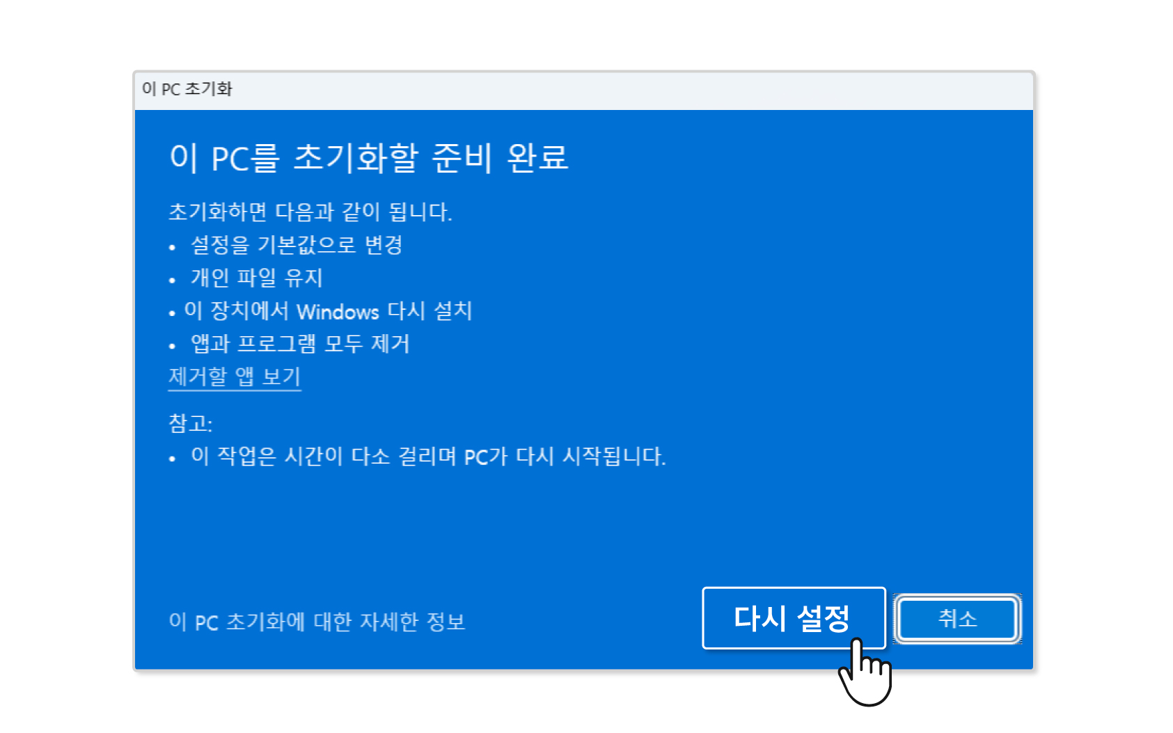• 파일, 프로그램, 설정, 계정 등의 컴퓨터의 모든 데이터를 완전히 제거하고 전부 초기화 됩니다.