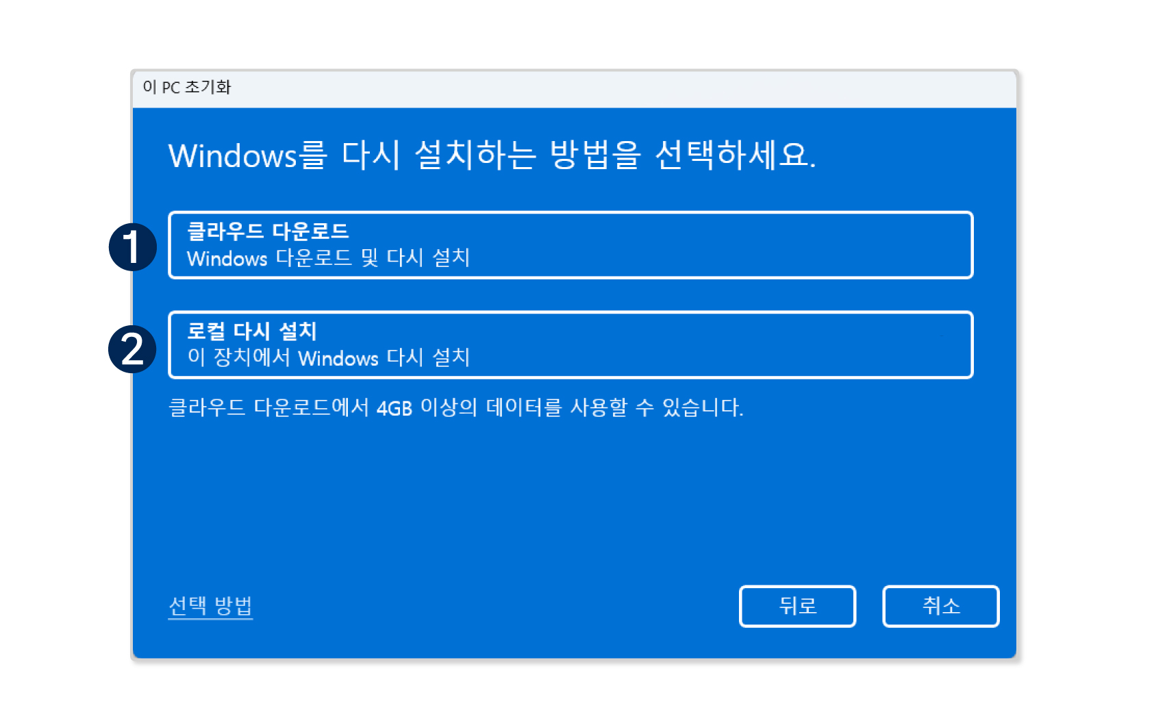 ⑤ [Windows를 다시 설치하는 방법을 선택하세요] 항목에서 [클라우드 다운로드] 또는 [로컬 다시 설치] 옵션 중 하나를 선택 (하단의 안내 내용을 보고 선택해주세요.)