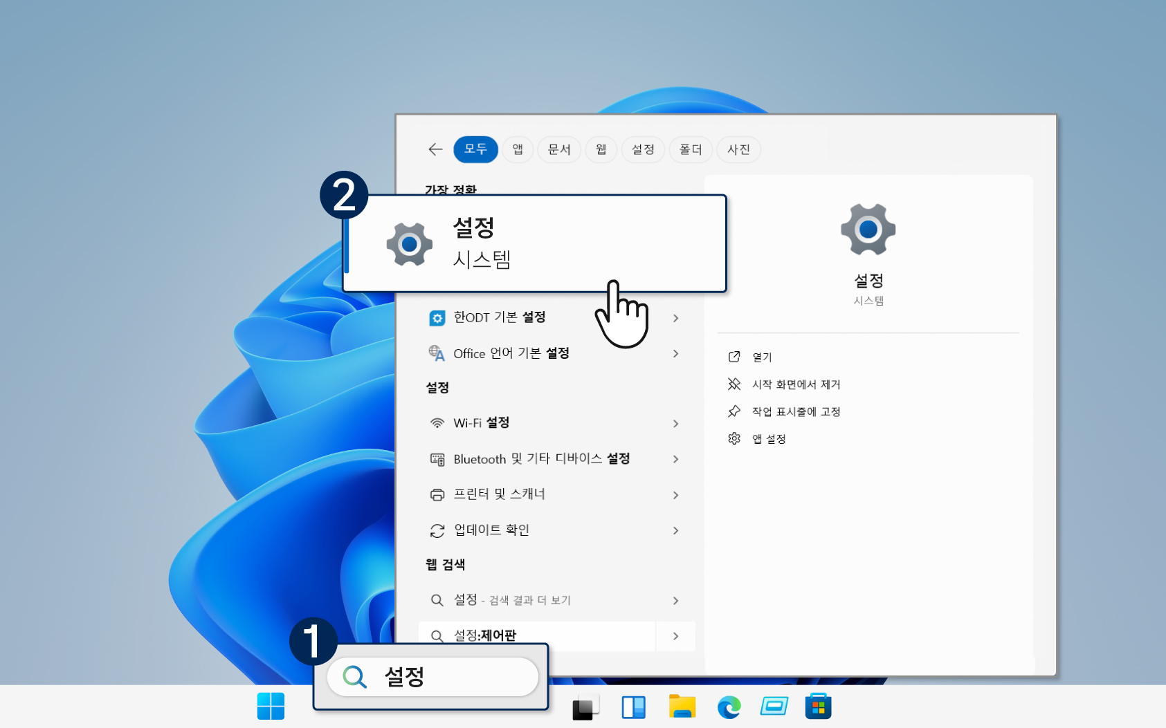① 윈도우 검색창에 설정을 입력 → [설정] 아이콘을 누르기