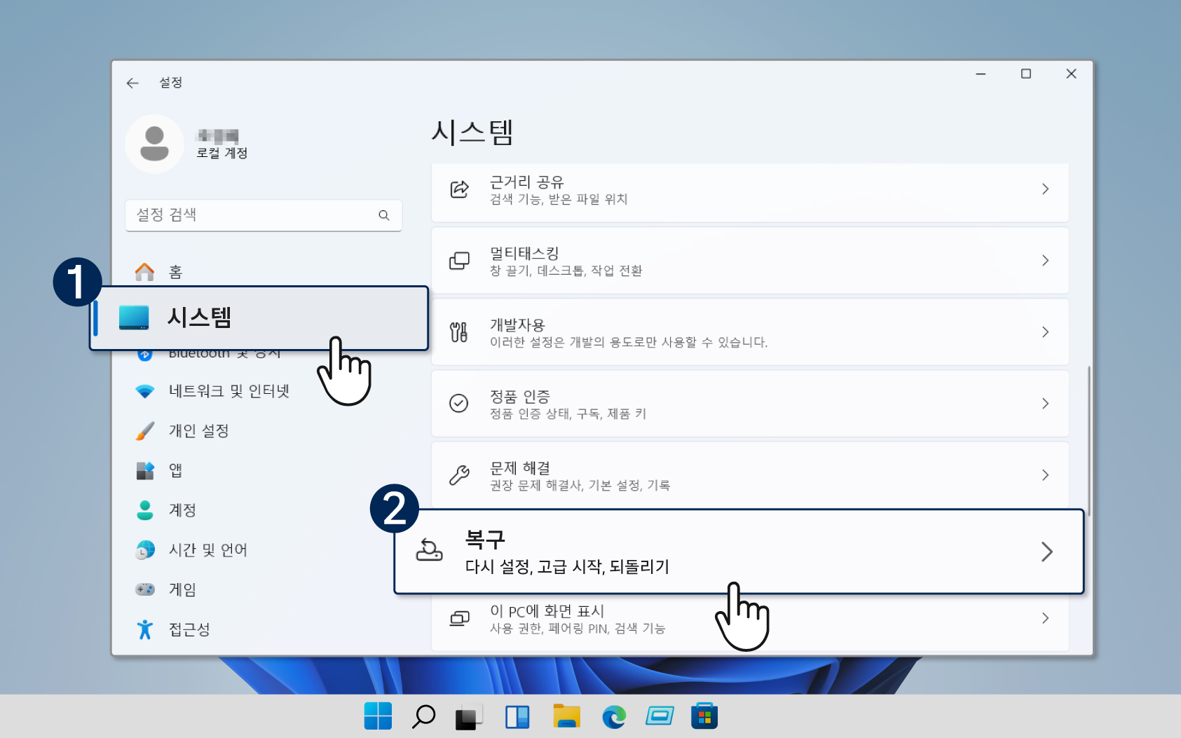 ② [설정] 선택 → 왼쪽 목록에서 [시스템] → [복구] 선택 클릭