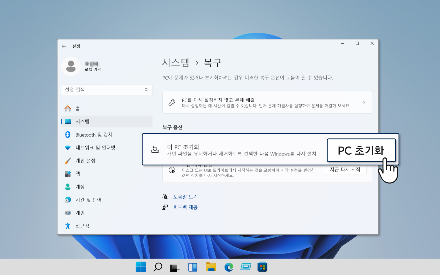 • 노트북의 경우, 배터리 전원으로 실행되는 동안에는 PC를 초기화할 수 없습니다.